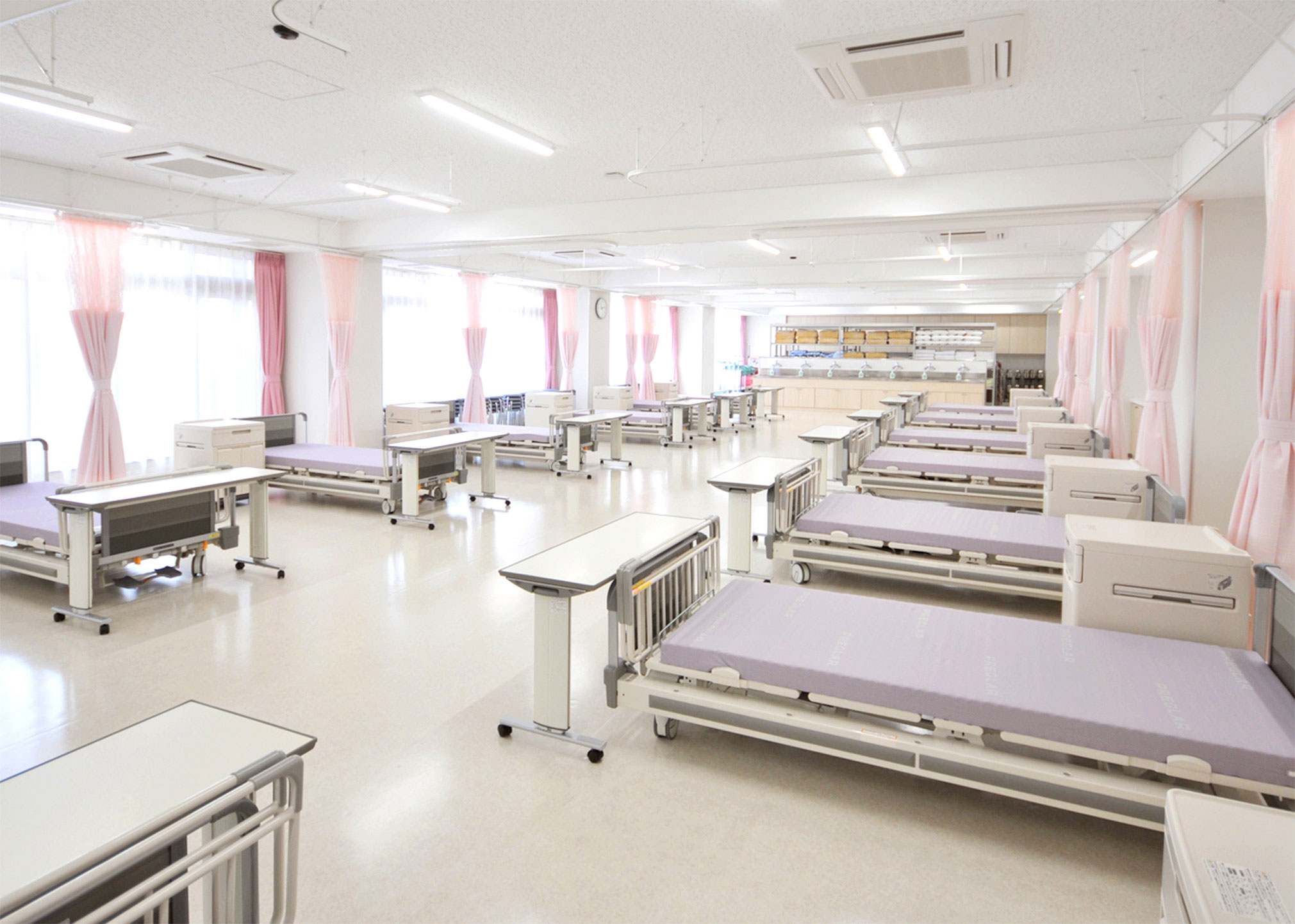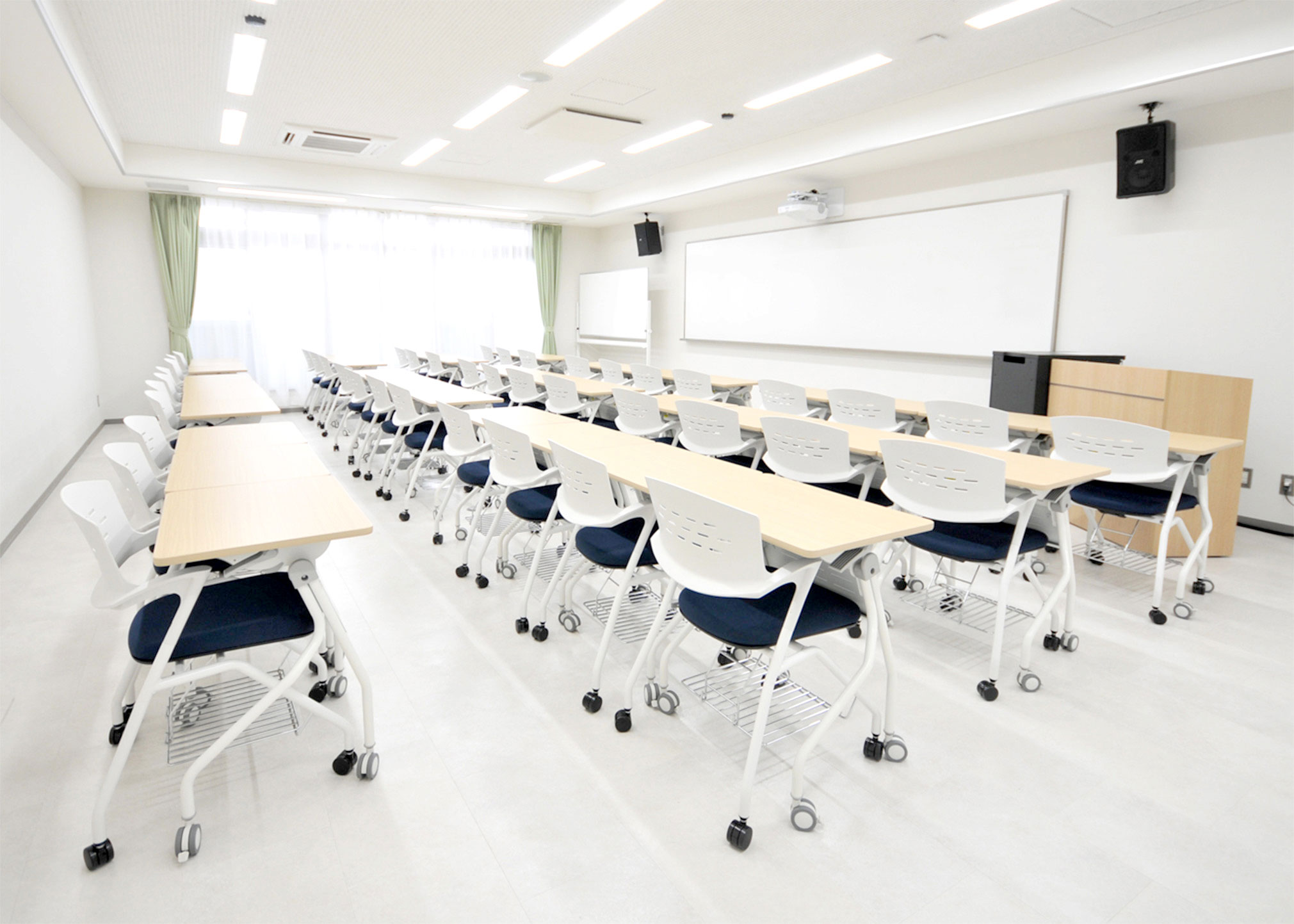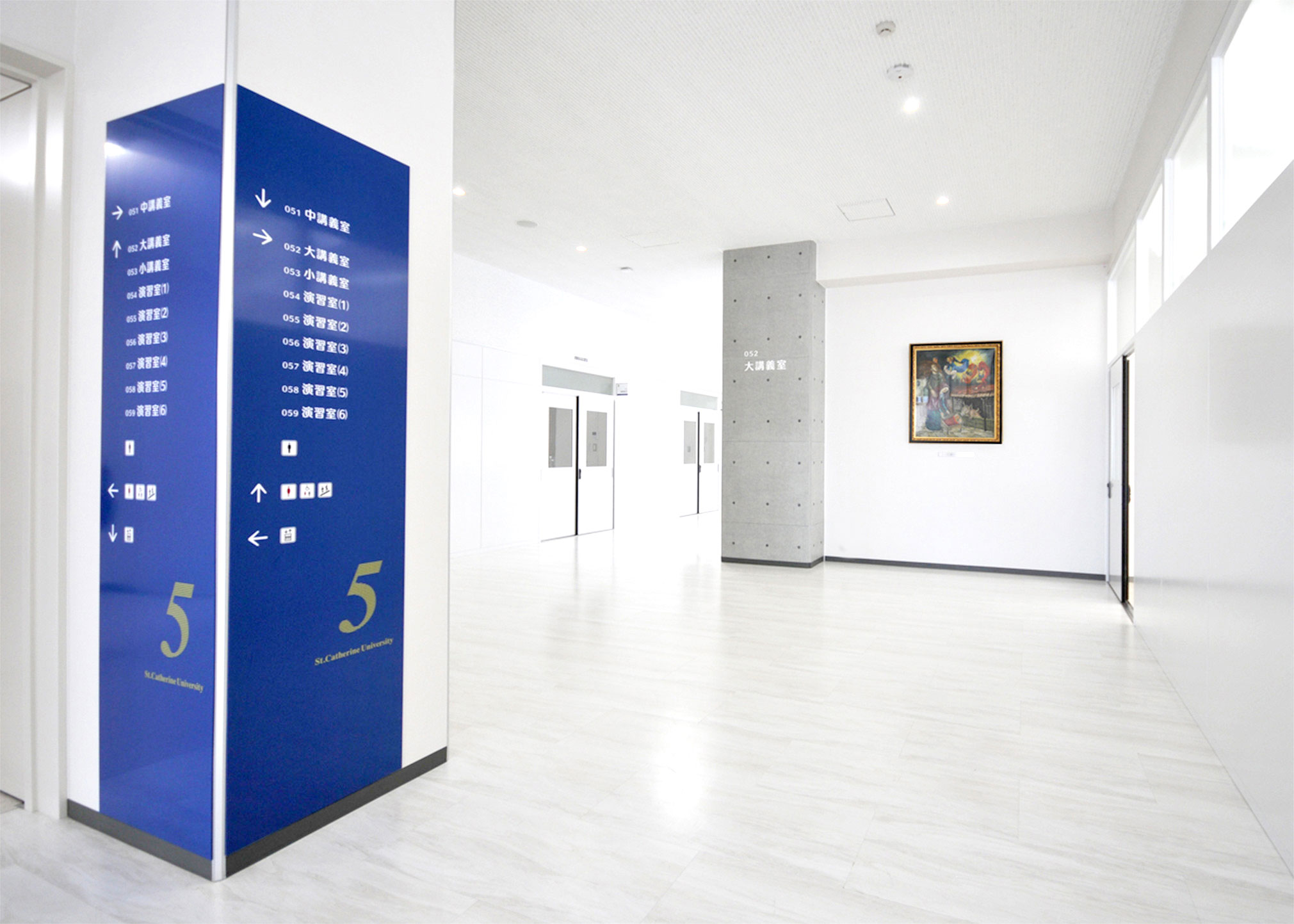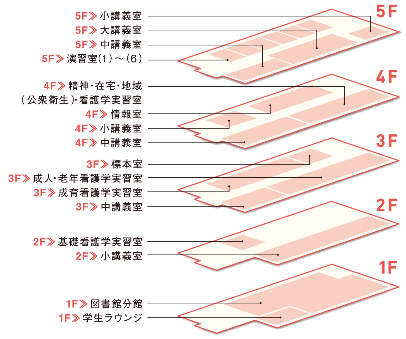 「聖カタリナ大学松山市駅キャンパス」に建設された看護学科新校舎は、それぞれ地上5階建ての講義棟と研究棟の2棟からなり、基礎、成育、成人・老年、在宅など領域別の実習室を完備しています。また、200名収容可能な大講義室では、市民講座やフォーラムも開催しています。さらに、講義棟1階には医学書を中心とした図書館分館を設置し、教育研究活動に役立てるとともに、一般の方々へも開放するなど、地域医療の情報発信基地としても活用しています。学内全体にWi-Fi環境を完備し、学生ラウンジや学生専用ロッカーもあり、キャンパスライフを快適に過ごせる空間となるよう工夫されています。