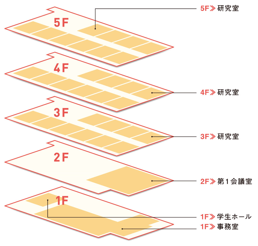 また、2Fには講義室・実習室、3Fには標本室、4Fには情報室、5Fには大講義室があり、2階より上階が学習スペースとして設けられています。建物内教室・施設一覧