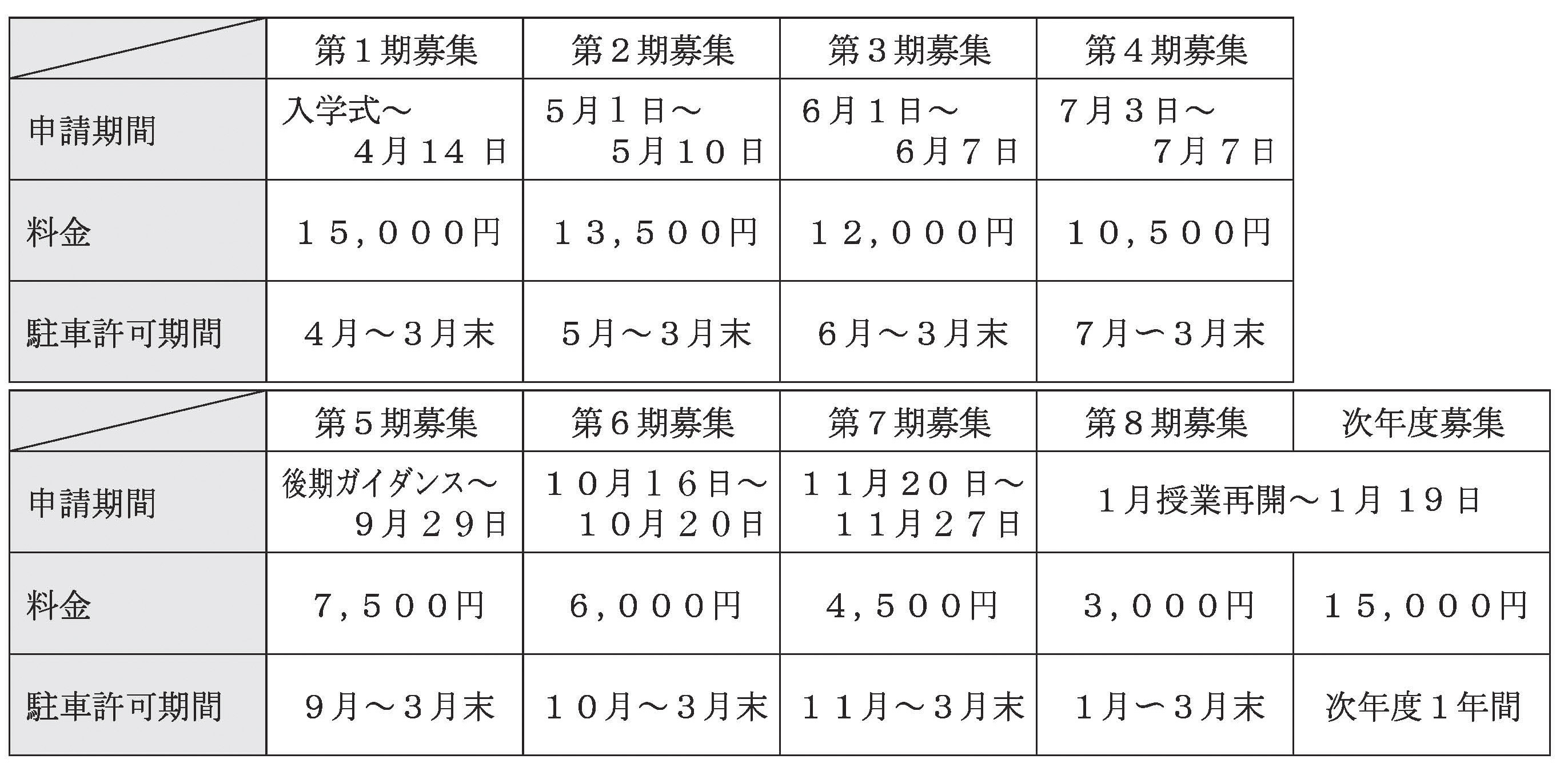 ※学内行事=入学式、オリエンテーション、後学期ガイダンス、保健講話、大学祭当日、卒業式は平日・土・日・祝日に関係なく無料。