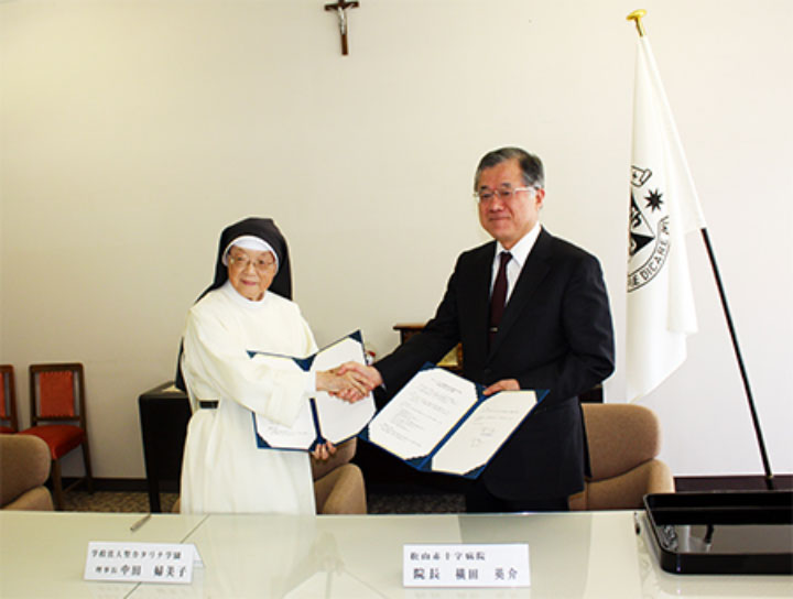 2015年より、松山赤十字病院(院長:横田英介)と学校法人聖カタリナ学園(理事長:中田婦美子)・聖カタリナ大学(学長:ホビノ・サンミゲル)は、本学看護学科の運営に関する協力協定を締結しています。 本協定は、松山赤十字病院と本学看護学科とが相互に協力して、地域医療に貢献できる優秀な人材を育成することを目的としています。