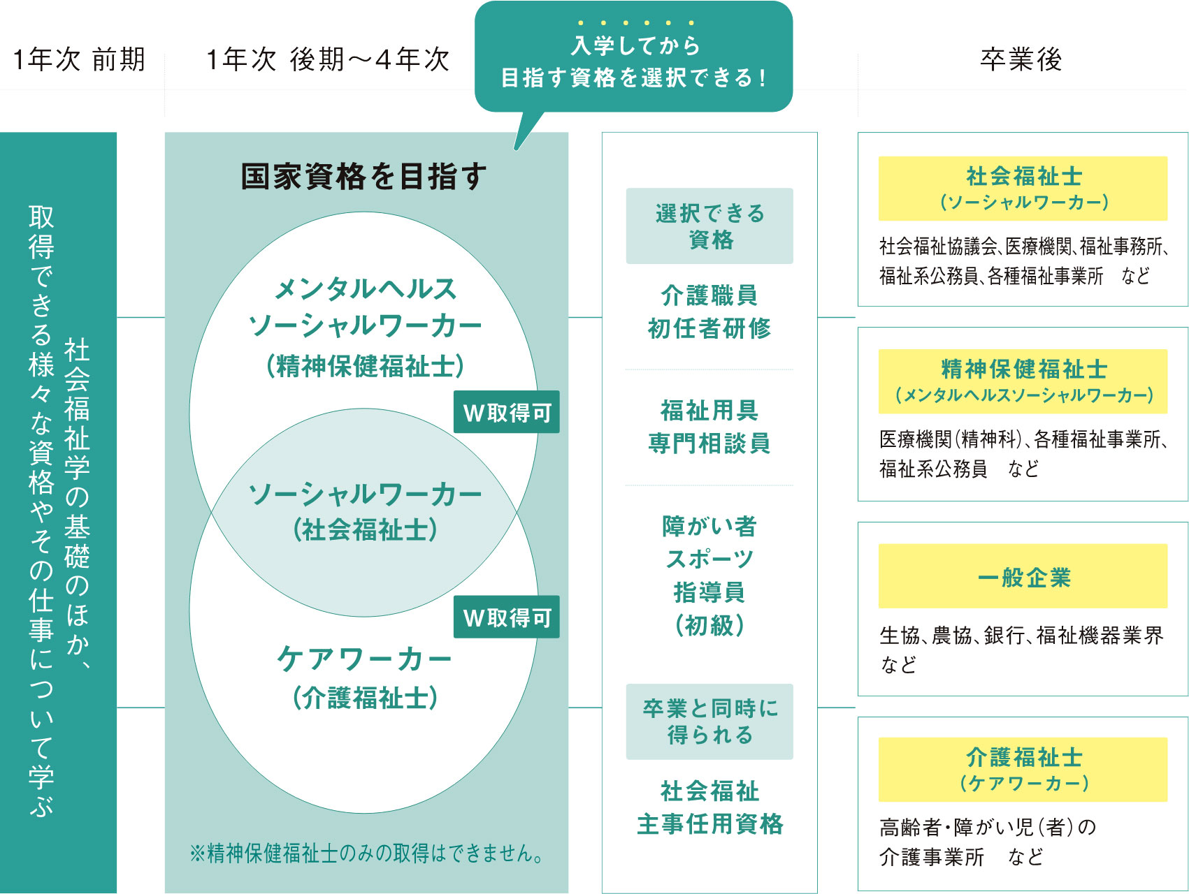 より専門性の高い4年生の介護福祉士養成は全国的にも数が少なく、社会福祉士と介護福祉士の2つの国家資格の取得が可能です。