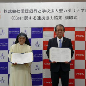 12月2日(木)、株式会社愛媛銀行(以下、愛媛銀行)と本学園は、SDGsの推進に関する連携協力協定調印式を聖カタリナ大学松山市駅キャンパスにおいて実施…