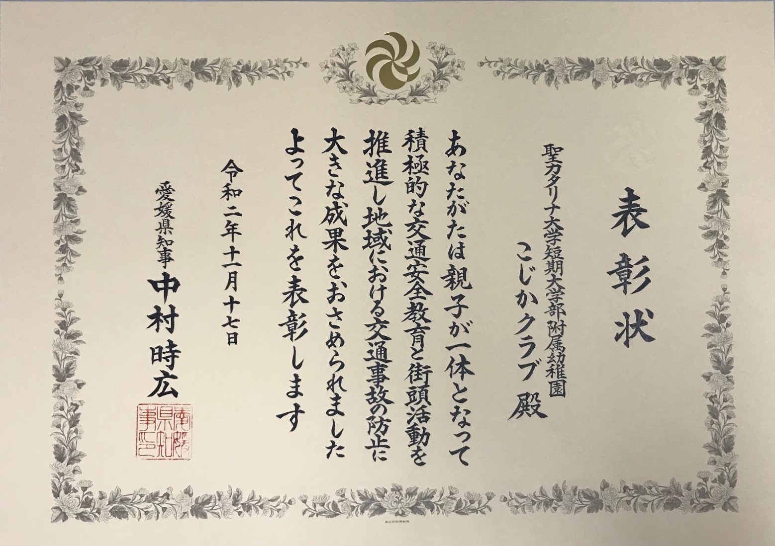 聖カタリナ大学短期大学部附属幼稚園が、交通安全活動に多大に貢献したとして、交通安全功労知事表彰を受けました。