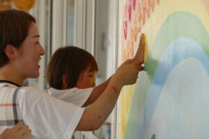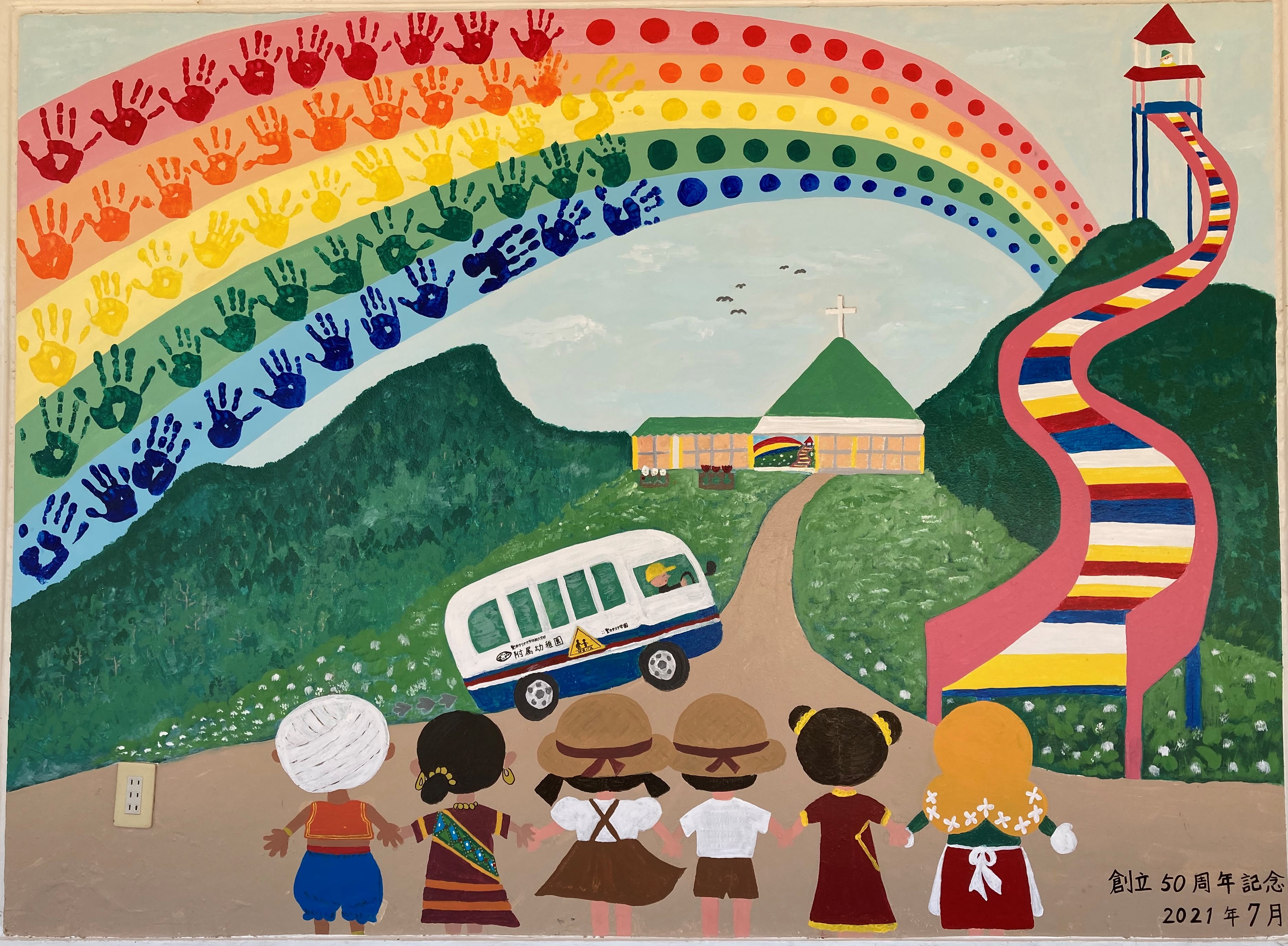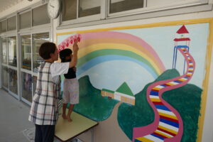 創立50周年を記念して園舎の壁に園児たちと教職員で壁画を描きました。