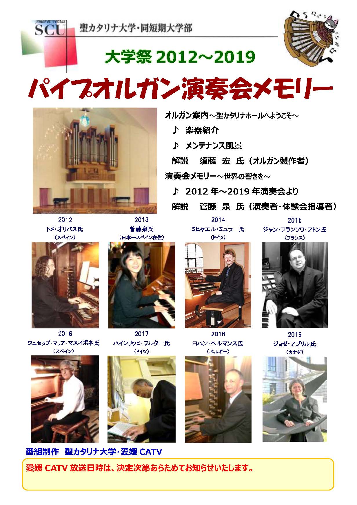 なお、2020年度「大学祭パイプオルガン演奏会」の代替プログラムとして、「大学祭2012~2019 パイプオルガン演奏会メモリー」と題する番組を制作中です。愛媛CATVでの放送日時が決まりましたら本ホームページでお知らせします。