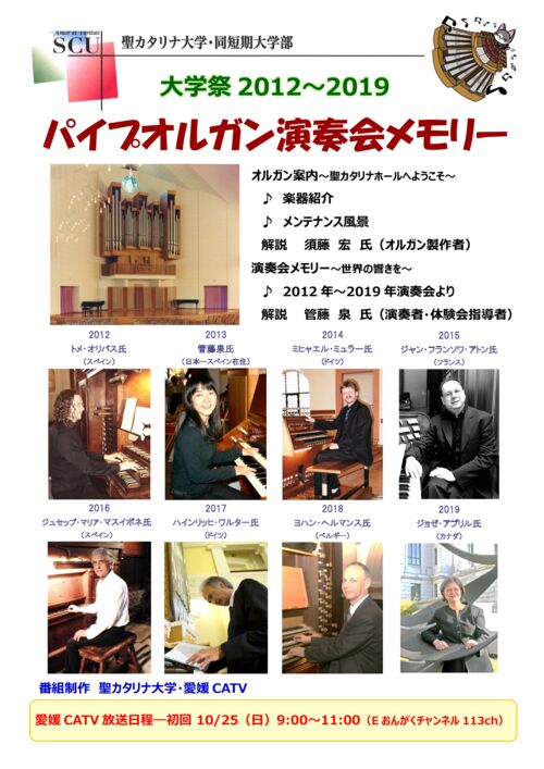 新型コロナウイルス感染拡大防止に向け、観客の皆さまの健康と安全を第一に考えて、今年の大学祭パイプオルガン演奏会は中止とさせていただきます。例年、聖カタリナホールほぼ満席で生のオルガンの響きを楽しみにしてくださる皆さまのご期待にそえず残念ですが、代替プログラムとして、「大学祭2012~2019 パイプオルガン演奏会メモリー」と題する番組を、愛媛CATVで初回10月25日(日)9:00~11:00(イベントチャンネル112ch)に放送します。