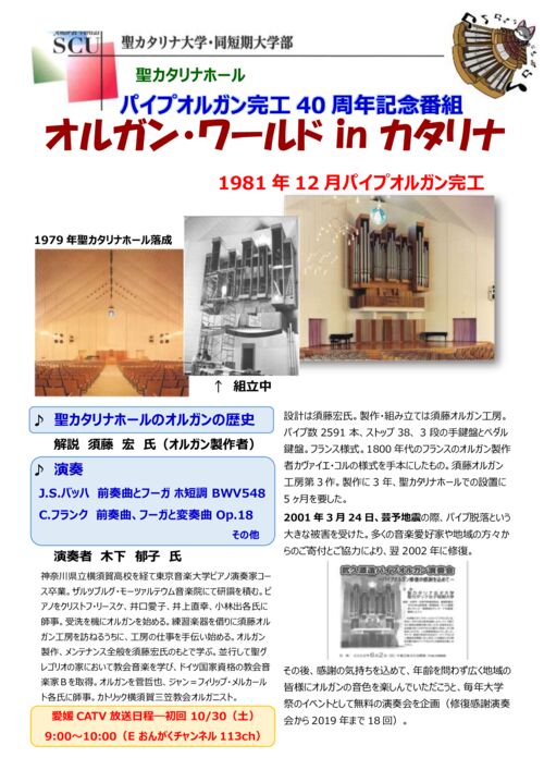 ぜひ番組をご覧いただき、聖カタリナ大学のオルガンの世界をお楽しみください。