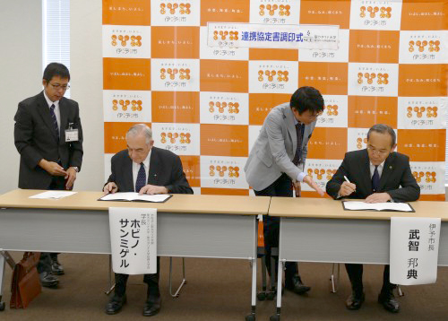 調印式では、武智邦典 伊予市長とホビノ・サンミゲル学長が協定書を交わしました。