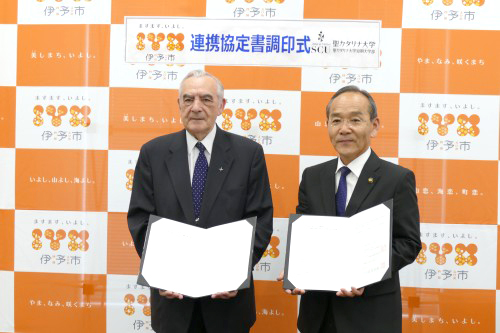 7月3日(火)、伊予市役所で「聖カタリナ大学・聖カタリナ大学短期大学部と伊予市との連携に関する協定」の調印式が開催されました。