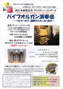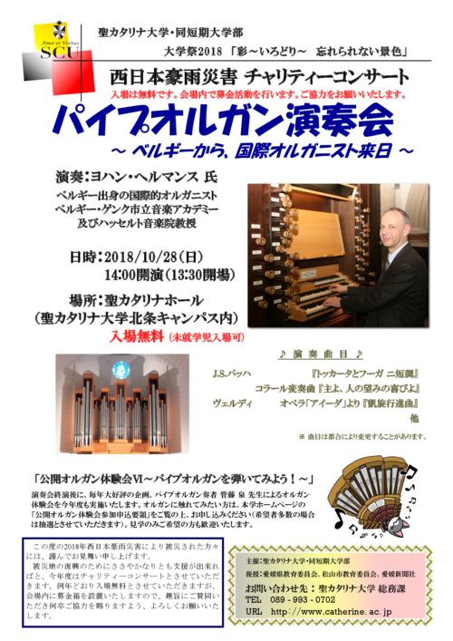 聖カタリナ大学・同短期大学部 大学祭2018の最終日に企画いたしましたので、多くの皆様のご来場をお待ちしております。 荘厳で音響豊かな聖カタリナホールで、西日本最大規模のパイプオルガンの音色によるゆったりとした上質な時間をお過ごしください。