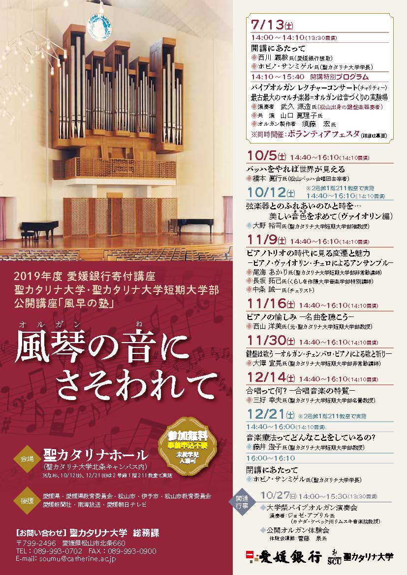 昨年度は「新しい時代をいきる」をメインテーマとし寄付講座を開講いたしましたが、本年度は「風琴(オルガン)の音(ね)にさそわれて」をメインテーマに掲げ、7月13日(土) 14:00より開講します。
