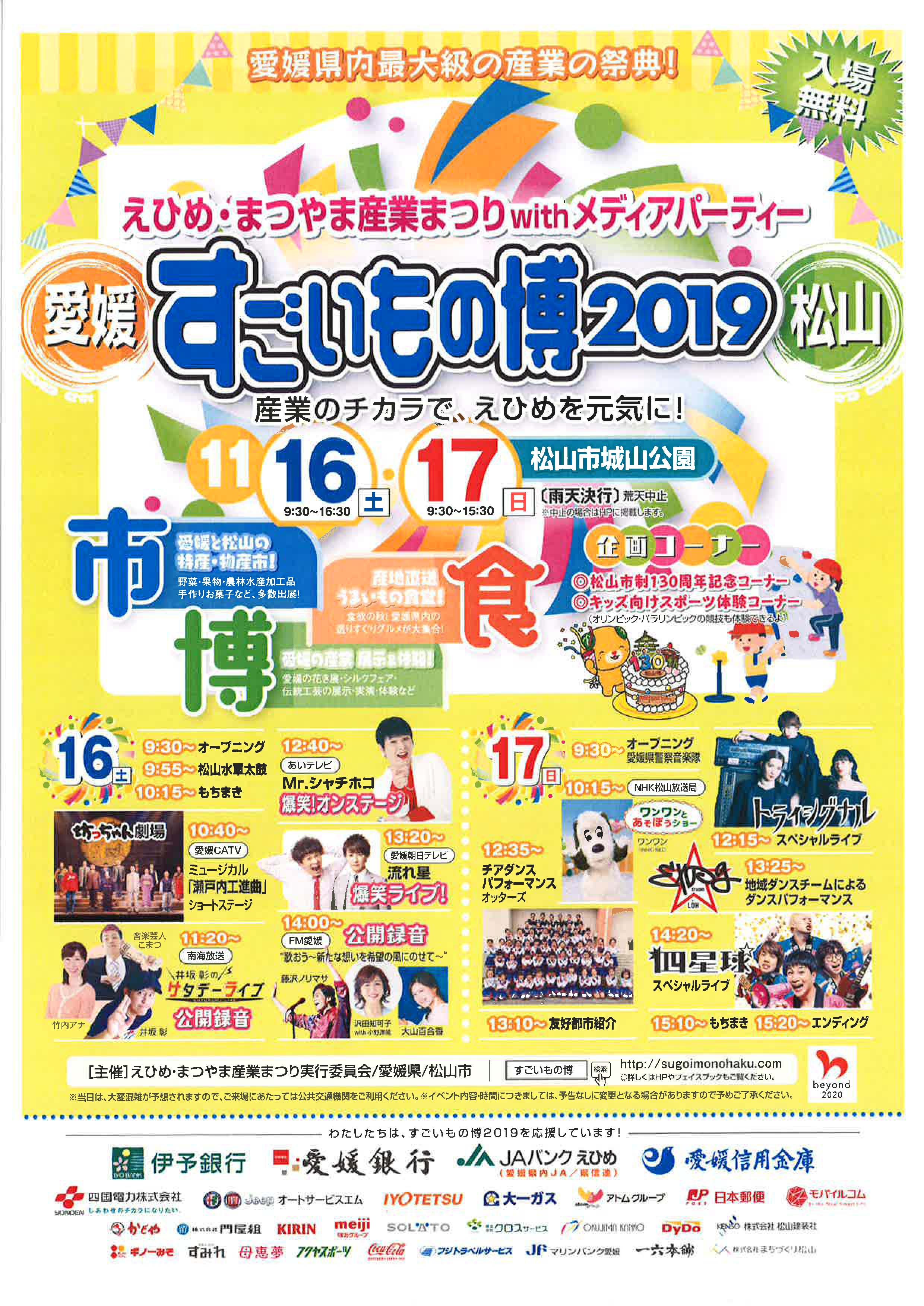 本イベントは例年10万人以上の方が来場されるイベントで、合計250の様々なブースが出店され、メインステージでは「Mr.シャチホコ 爆笑オンステージ」「流れ星爆笑ライブ」「トライシグナル」「四星球」等のライブ等が開催されますので、会場(松山市城山公園)へ是非ご来場ください。