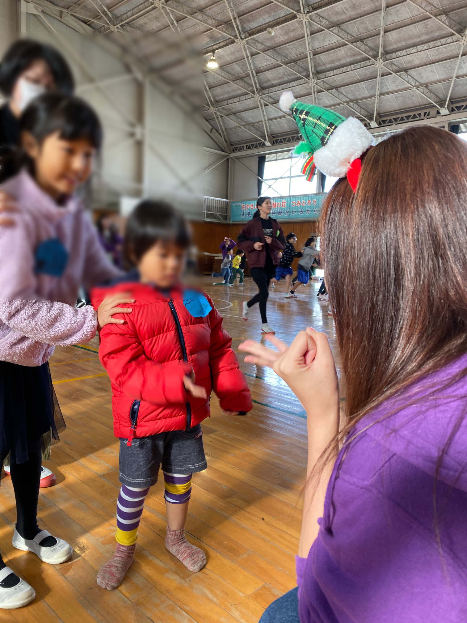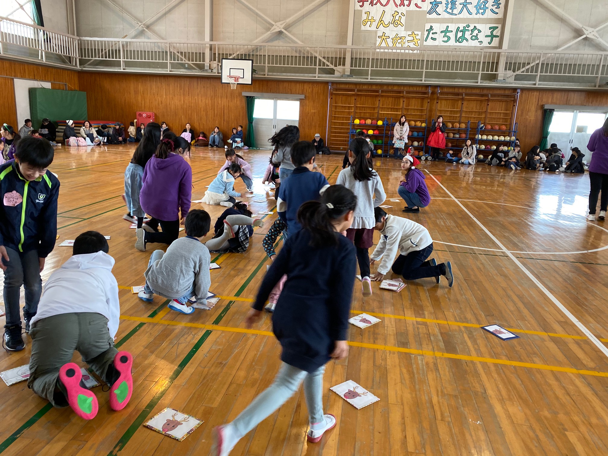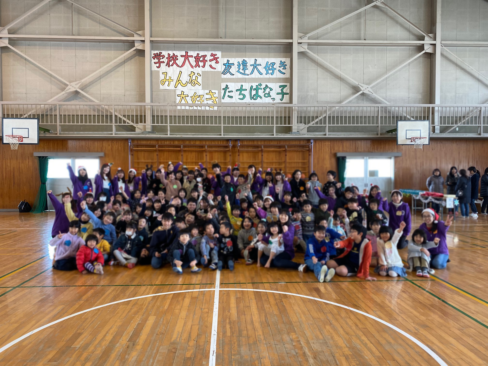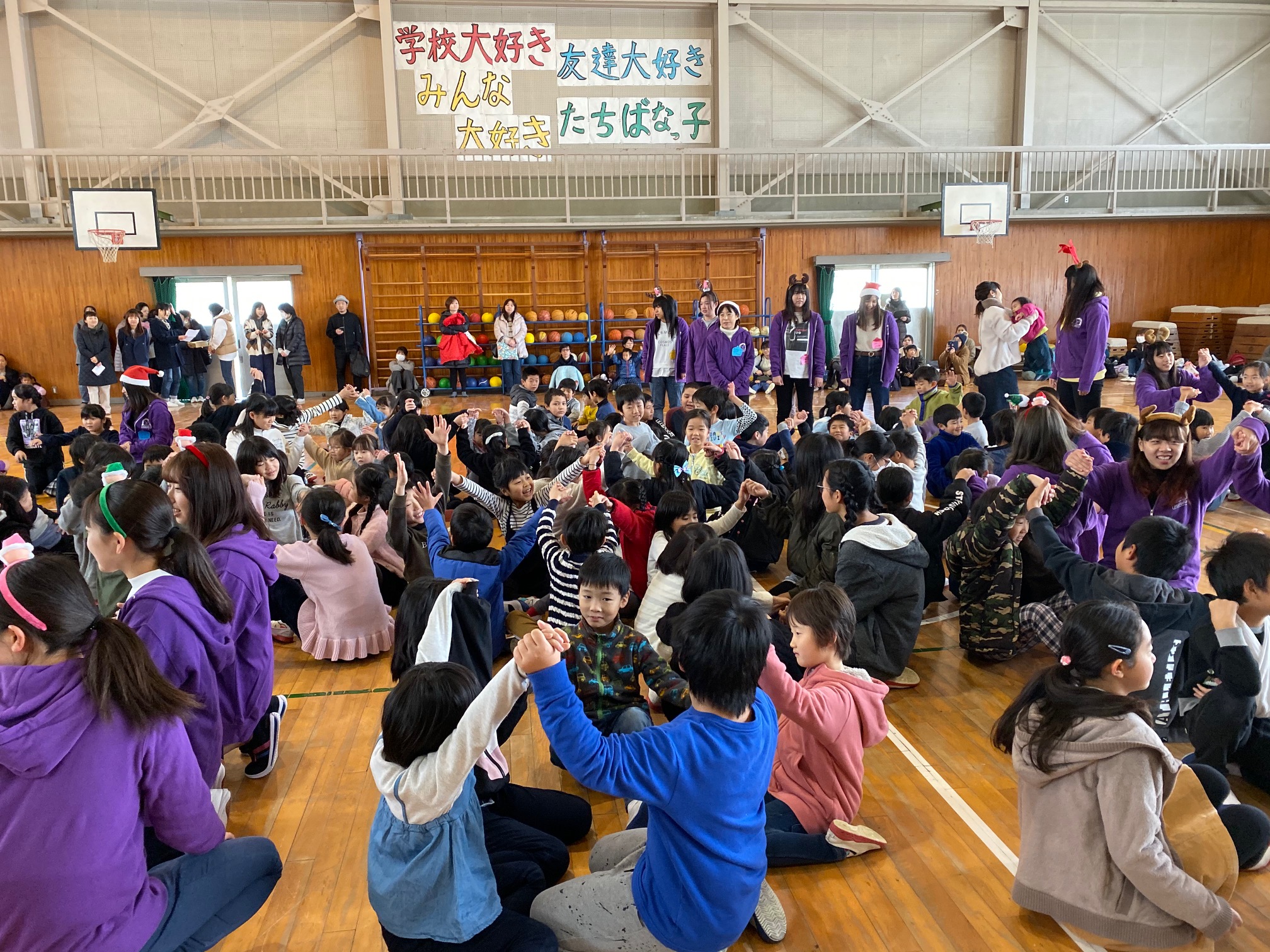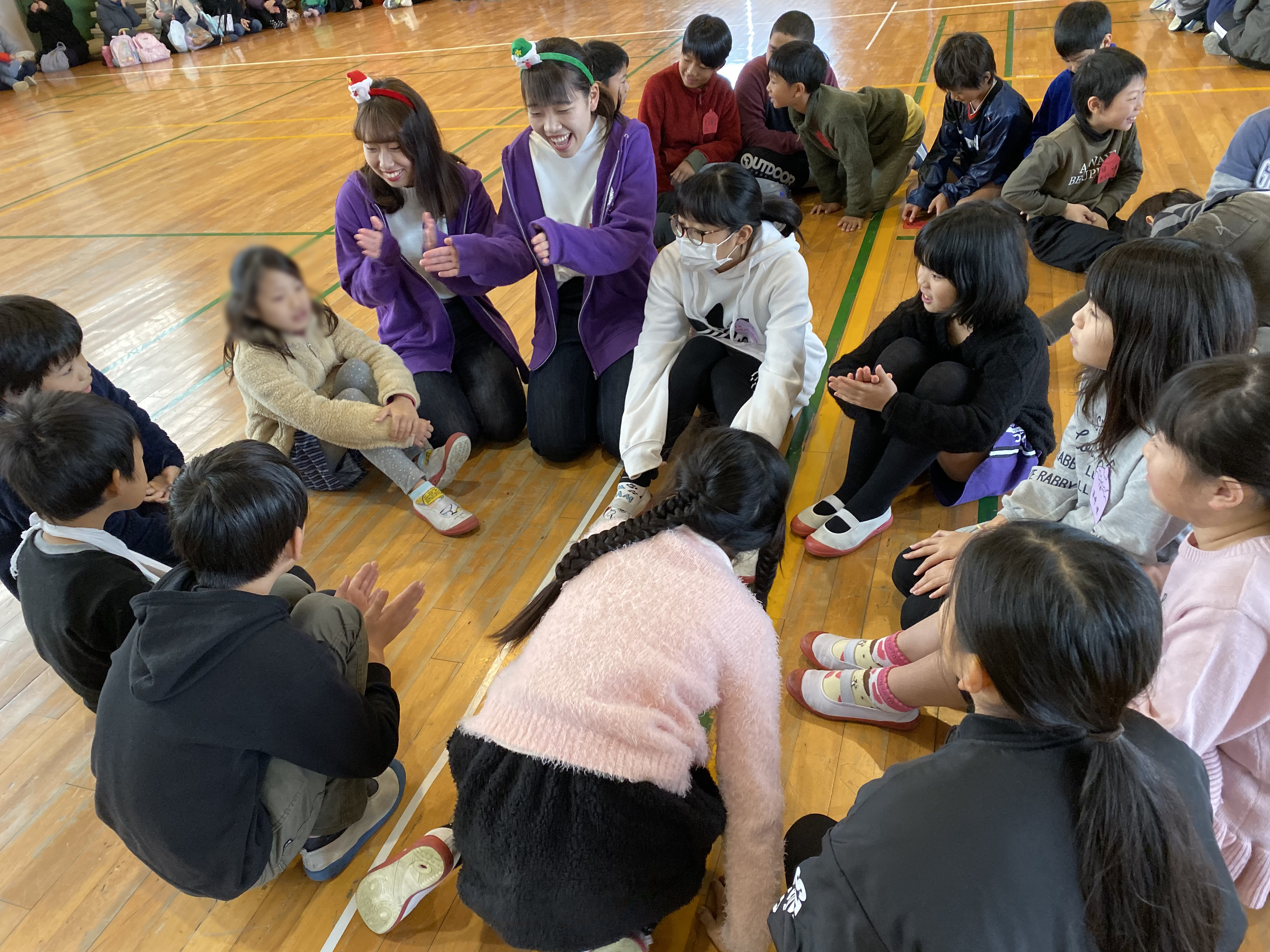 このイベントは毎年お手伝いしている恒例イベントで、本学学生がクリスマスにちなんだ様々なレクリエーション(集合あそび、カードめくり競争、じゃんけんゲームなど)を企画・実施し、1年生~6年生までの児童約230名と一緒に楽しい時間を過ごしました。