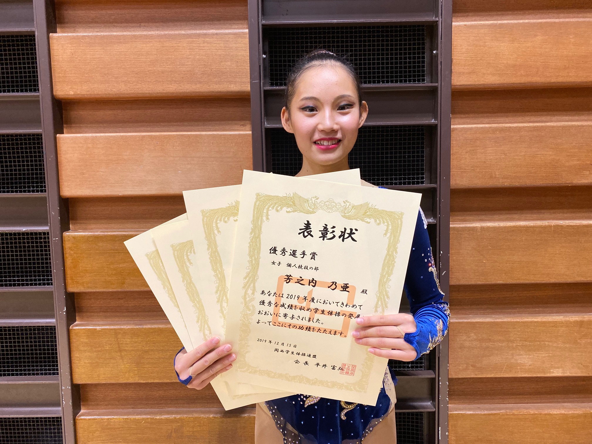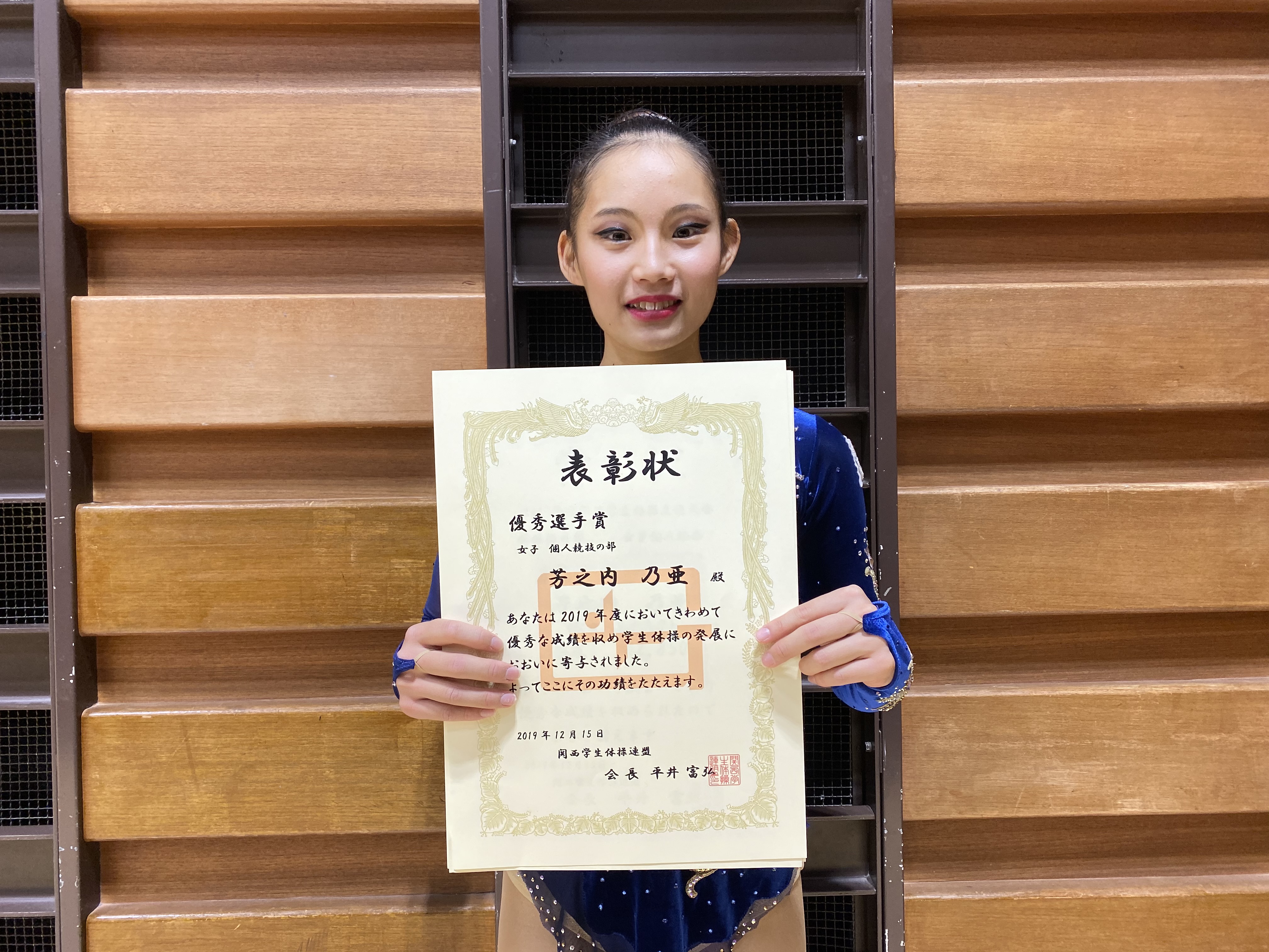 本学、健康スポーツ学科2年の芳之内乃亜さんが個人競技に出場し、個人総合2位、種目別競技のボールでは優勝、フープで2位の成績を収めました。また、2019年度『優秀選手賞』を受賞いたしました。