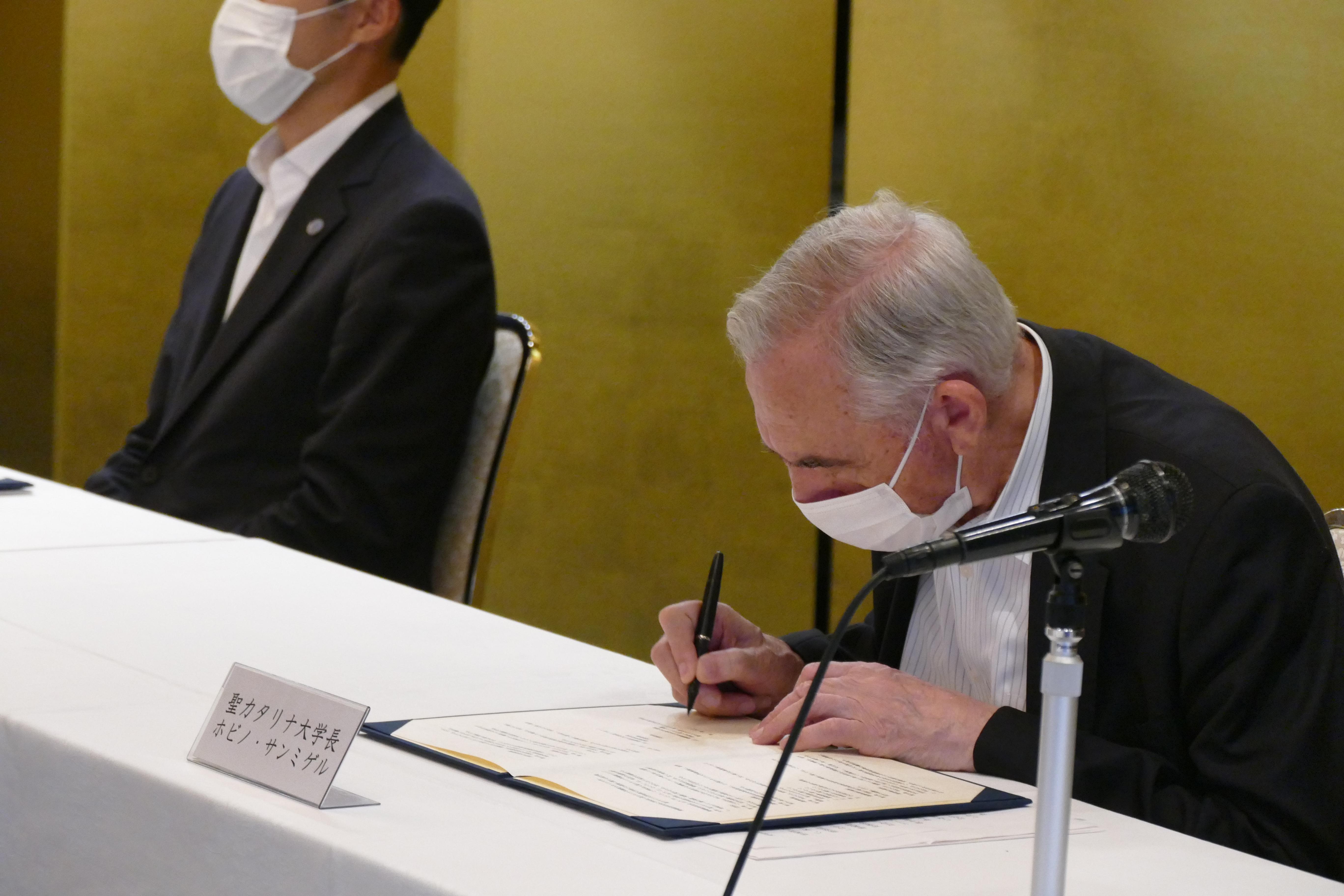 調印式では、愛媛経済同友会の代表幹事 西川義教氏(愛媛銀行頭取)と代表幹事 清水一郎氏(伊予鉄グループ代表取締役社長)、ホビノ・サンミゲル学長が協定書を交わしました。