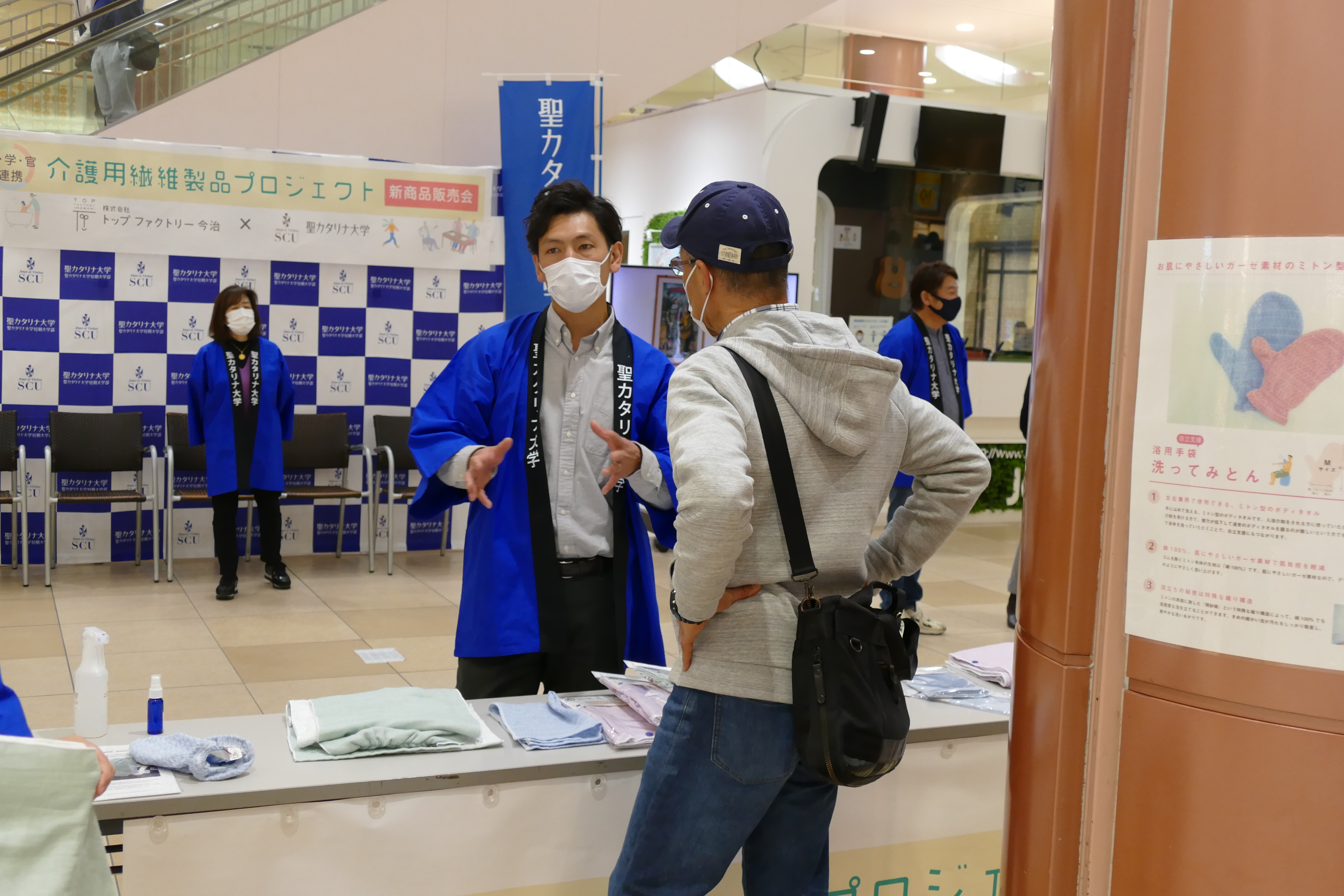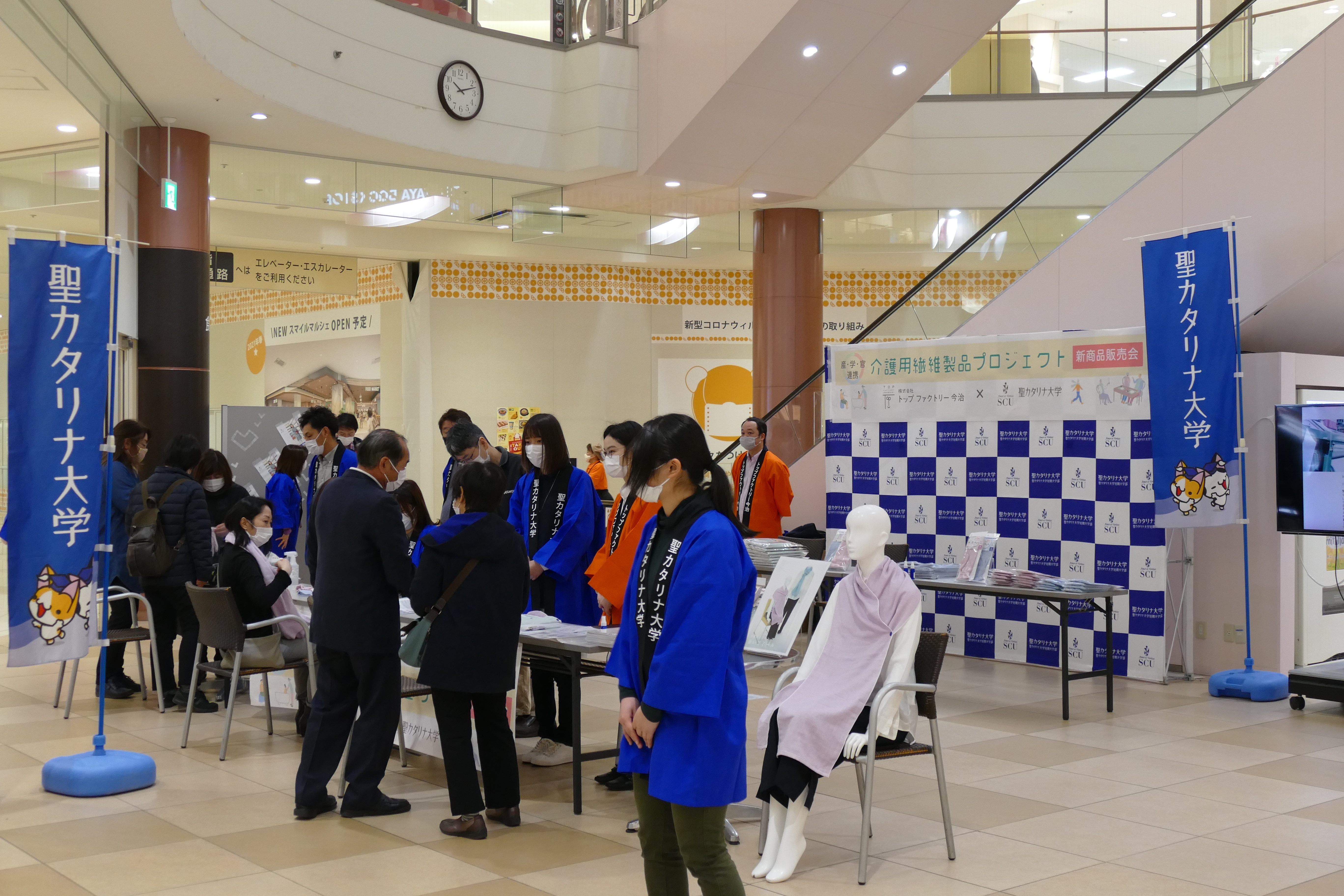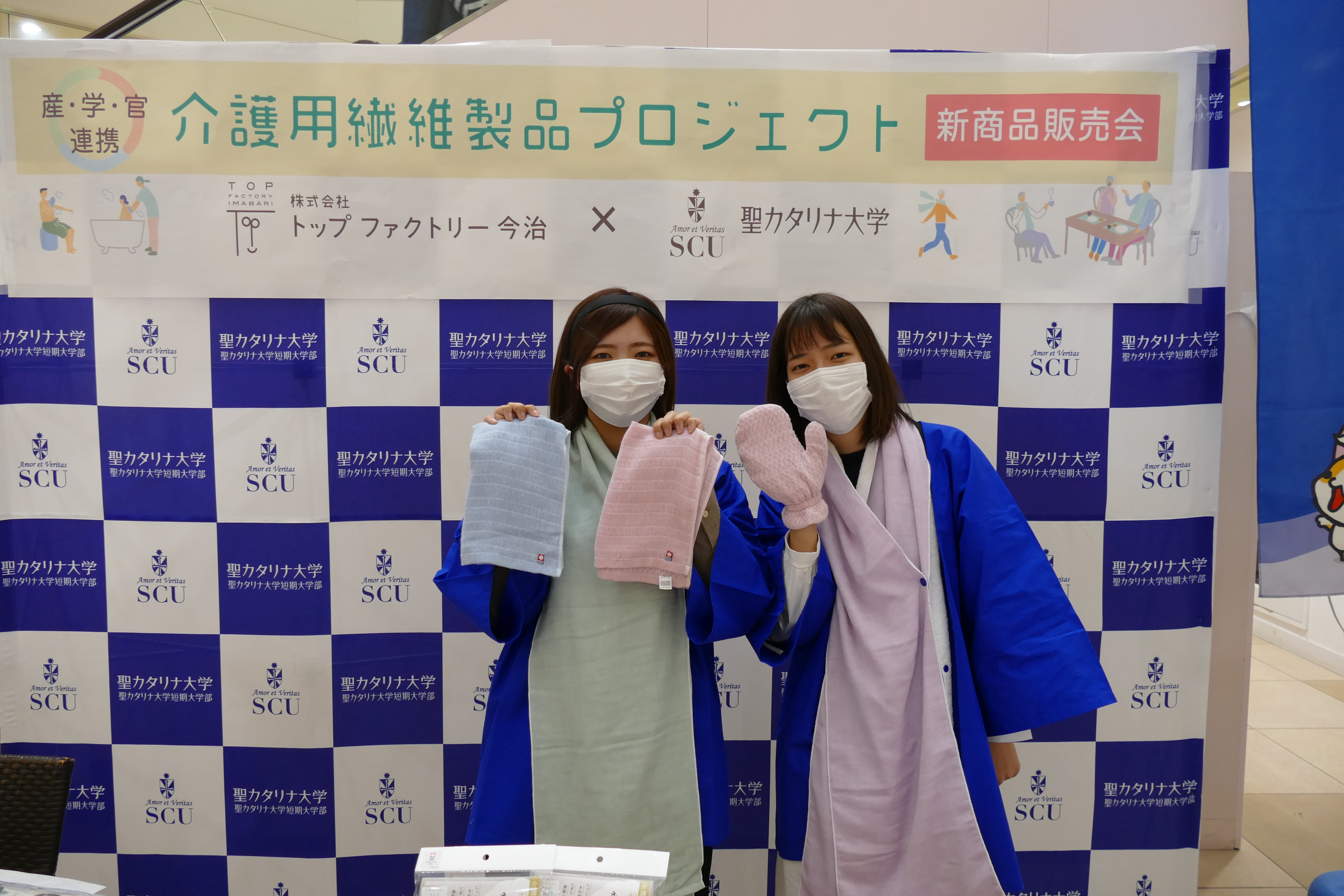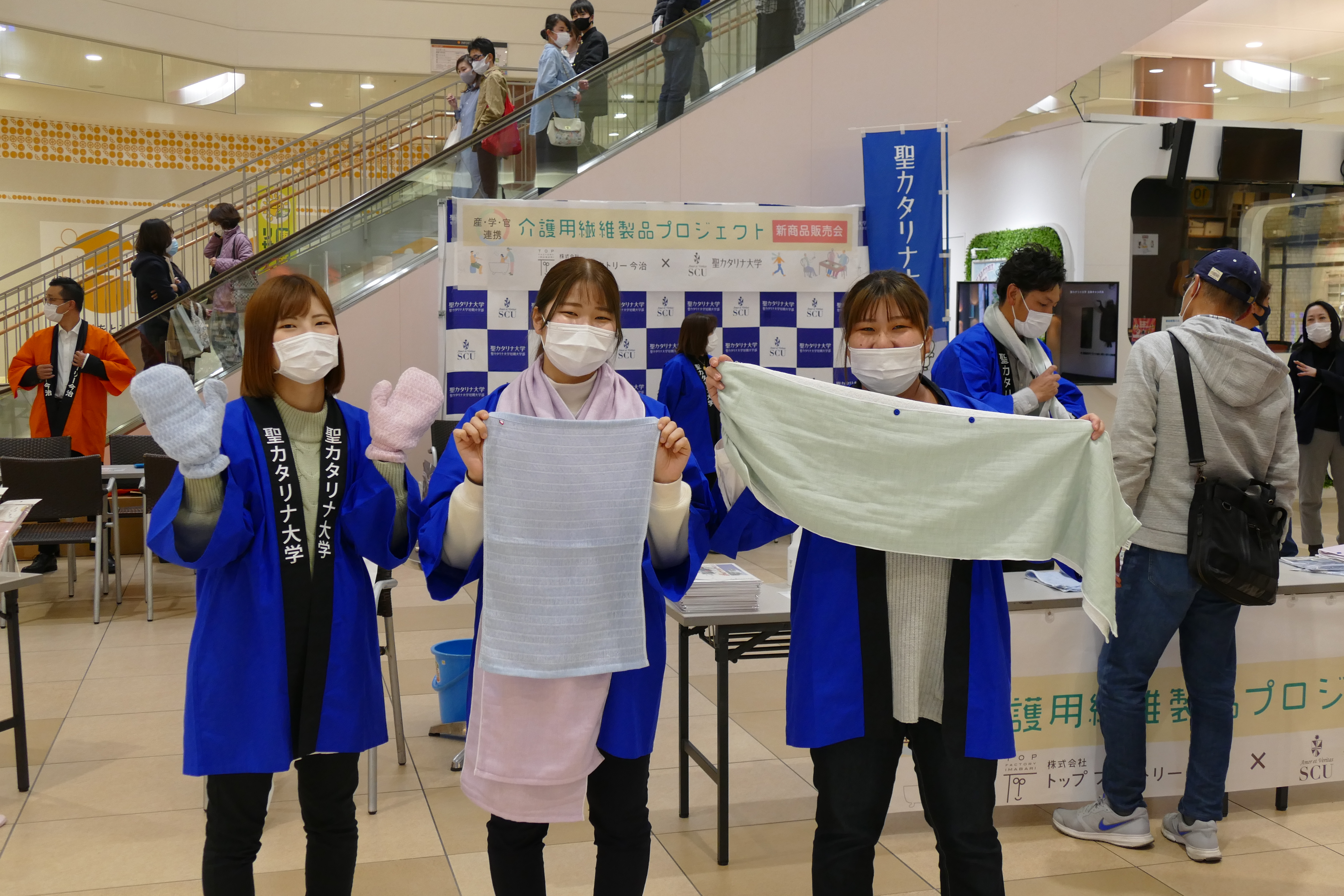 2月28日(日)、産学官連携事業(㈱トップファクトリー今治、愛媛県産業技術研究所繊維産業技術センター、聖カタリナ大学)で共同開発した新商品の販売会をエミフルMASAKIの1階フローラルコートで開催いたしました。