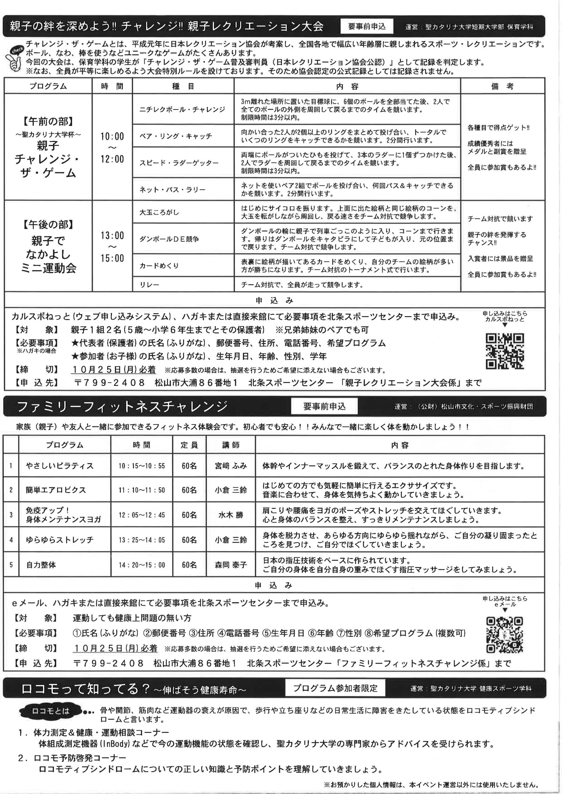 当日は、聖カタリナ大学杯「親子チャレンジ・ザ・ゲーム(成績優秀者にはメダルと副賞を贈呈。参加賞あり。)、親子でなかよしミニ運動会」、体力測定会&健康・運動相談コーナー、ファミリーフィットネス(ピラティス・エアロビ・ヨガ・自力整体等:定員各60名)など、無料で参加できます。(※親子チャレンジ・ザ・ゲーム、親子でなかよしミニ運動会、ファミリーフィットネスは事前申し込みが必要です)