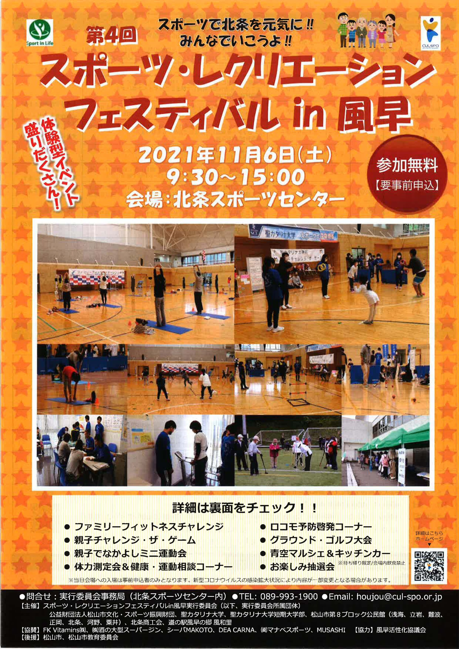 11月6日(土)、北条スポーツセンターで開催される「第4回スポーツ・レクリエーションフェスティバルin風早」のイベント運営に本学学生と教職員が協力します。