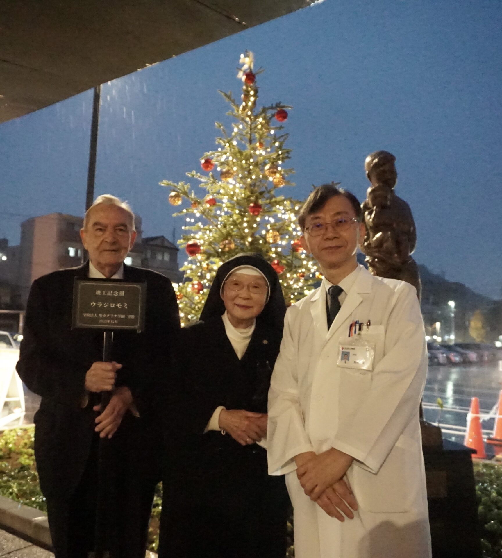12月21日(水)、松山赤十字病院の新病院の完成を祝い、学校法人聖カタリナ学園から竣工記念樹「モミの木」を寄贈し、贈呈式が同病院で行われました。