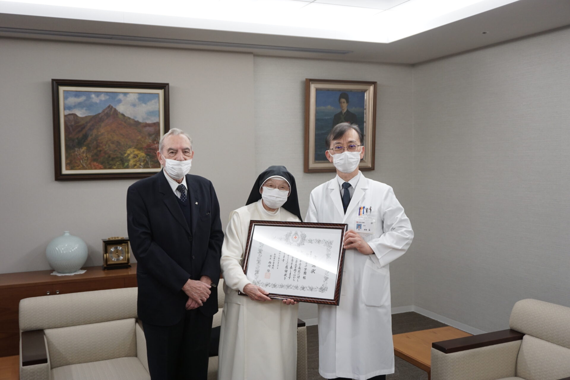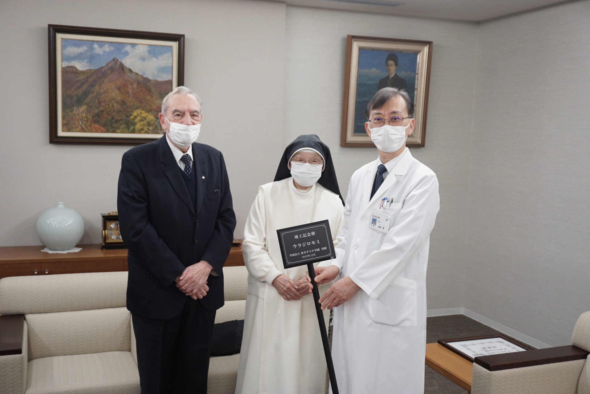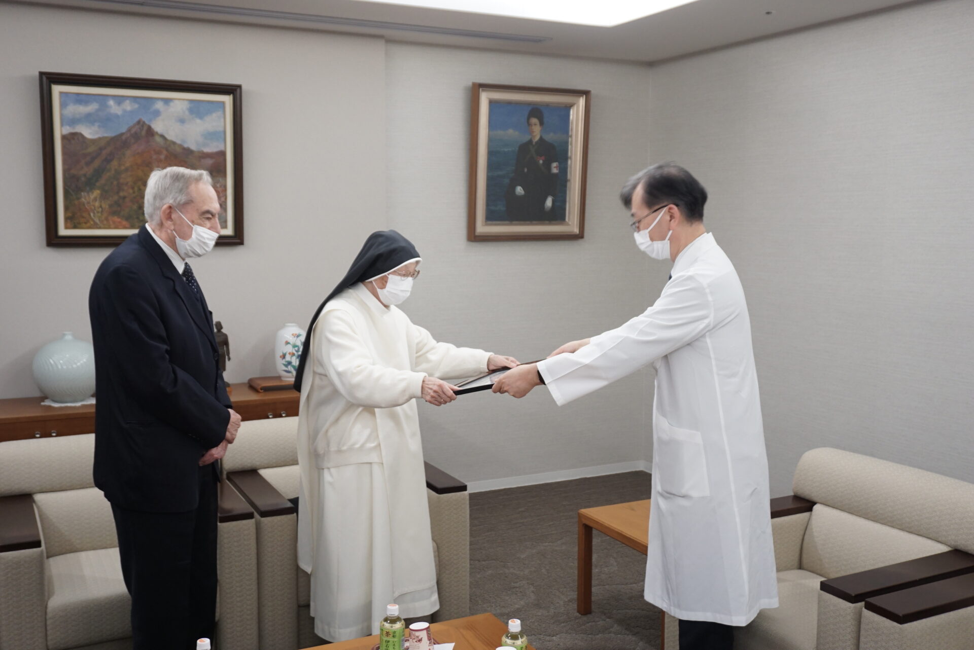 当日は、中田 婦美子 理事長とホビノ・サンミゲル 学長が同病院を訪れ、西﨑 隆 院長に目録等を手渡しました。
