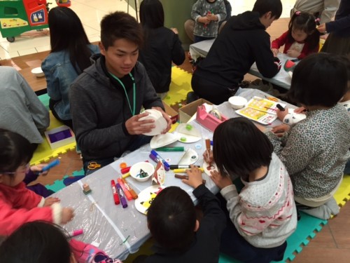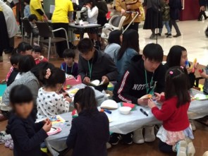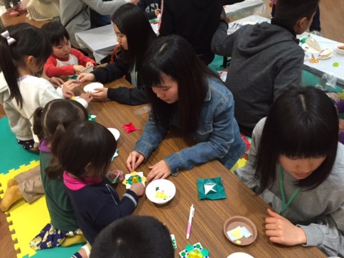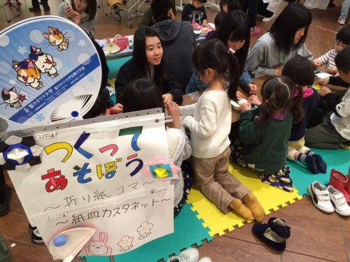 当日は、子どものあそび体験「おり紙でつくる花コマ、紙皿でつくるカスタネット」の運営を行い、子ども達と一緒におもちゃを作成して遊ぶなど約500名の親子の方に楽しい時間を過ごしていただきました。