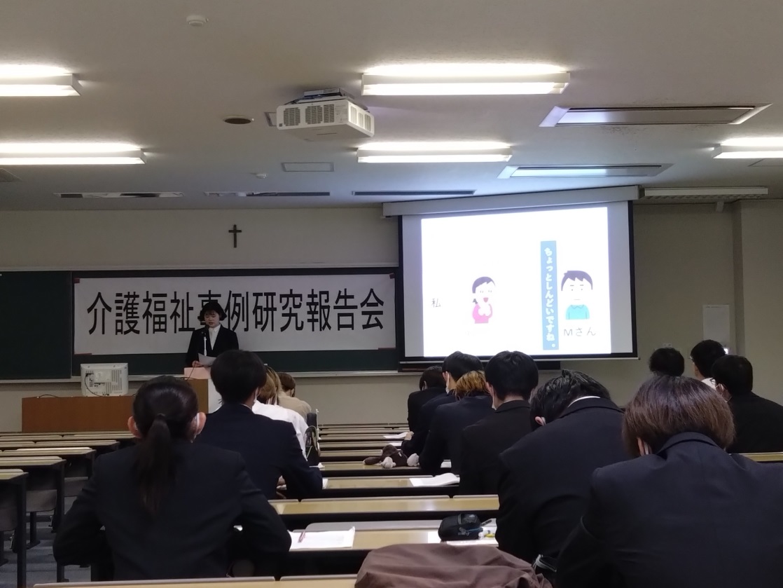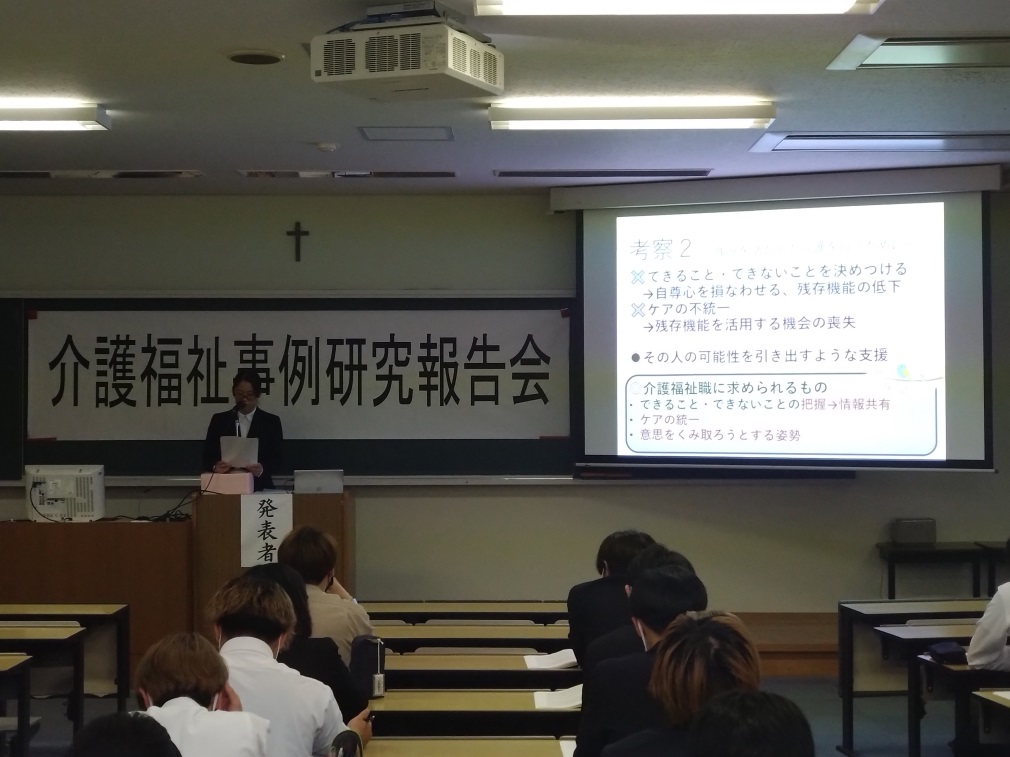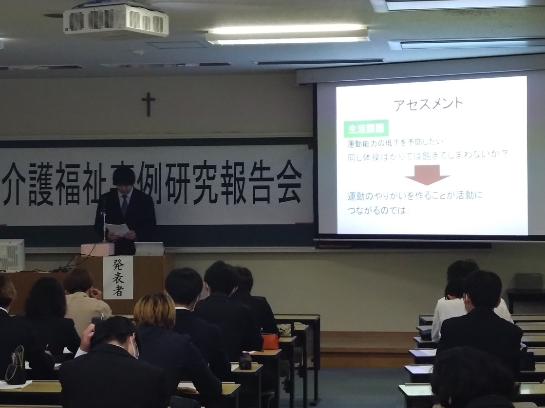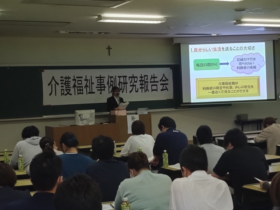 令和5年7月7日(金)「介護福祉事例研究報告会」を開催しました。 社会福祉学科介護福祉専攻の学生(令和2年度入学)が、介護福祉実習第1期から第4期(464時間)の集大成として、現場実習で受け持たせていただいた利用者に対する介護過程をケーススタディとしてまとめ、発表しました。 施設長、実習指導者や介護福祉士会の方にもご来場いただき、求められる介護についての考察、自身の介護観について報告しました。