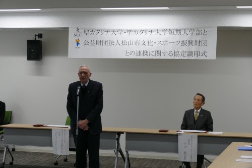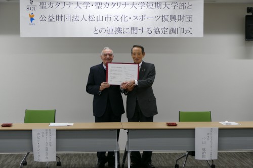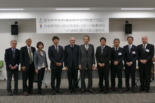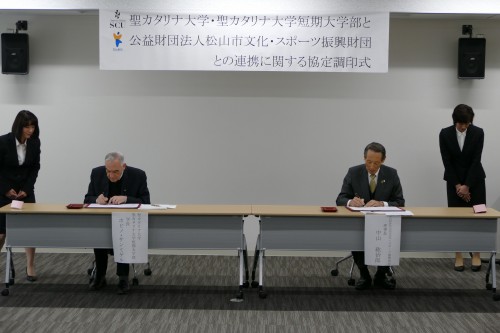 12月12日(火)、公益財団法人松山市文化・スポーツ振興財団と聖カタリナ大学・聖カタリナ大学短期大学部との連携に関する協定調印式が松山市駅キャンパスで行われました。