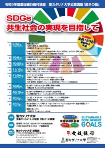 令和3年12月に株式会社愛媛銀行と学校法人聖カタリナ学園(聖カタリナ大学)は、SDGsの推進に関する連携協力協定を締結しました。同協定の一環として愛媛銀行のご支援を受け、産官学連携事業(愛媛銀行・松山市・聖カタリナ大学)として公開講座を開講(全9回)いたします。