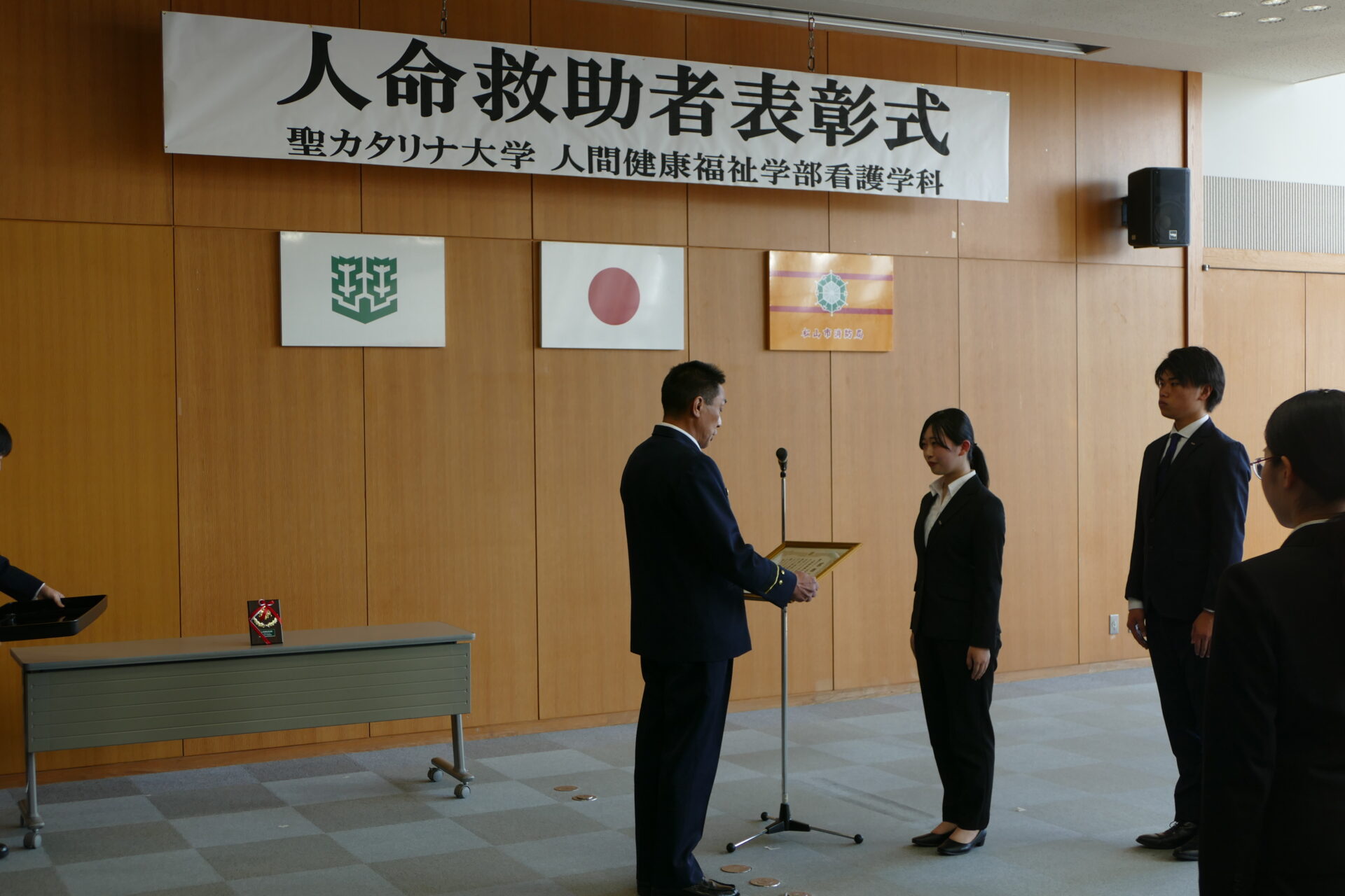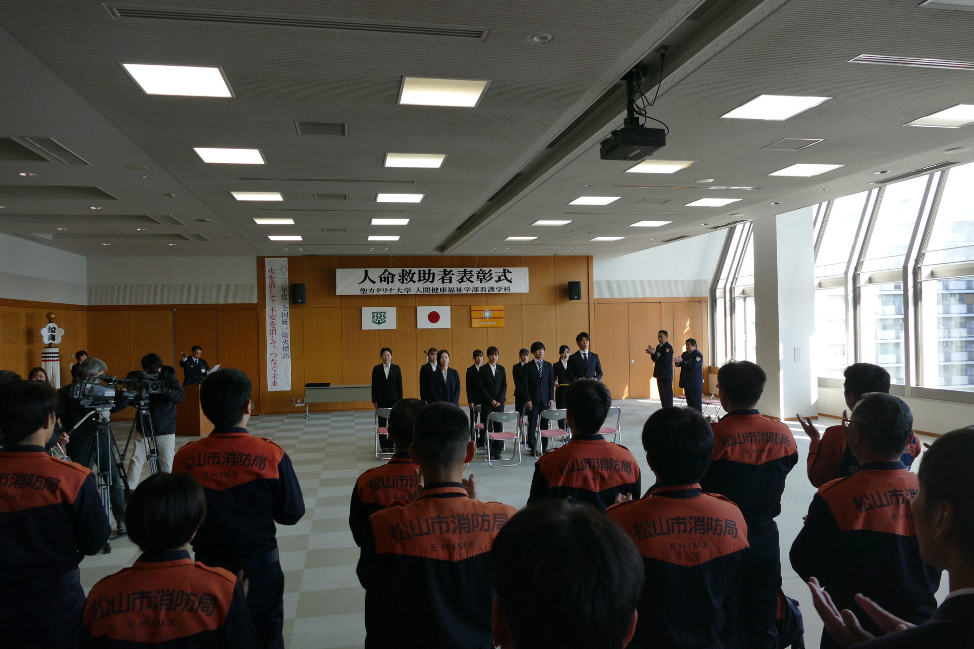 表彰式では大勢の松山市中央消防署員が列席する中、政田昌三署長から「本当に素晴らしい。皆さんの完璧な対応が救命に繋がった。」という感謝のお言葉とともに感謝状、盾をいただき、学生たちは改めてかけがえのない命を救うことができた喜びを感じていました。