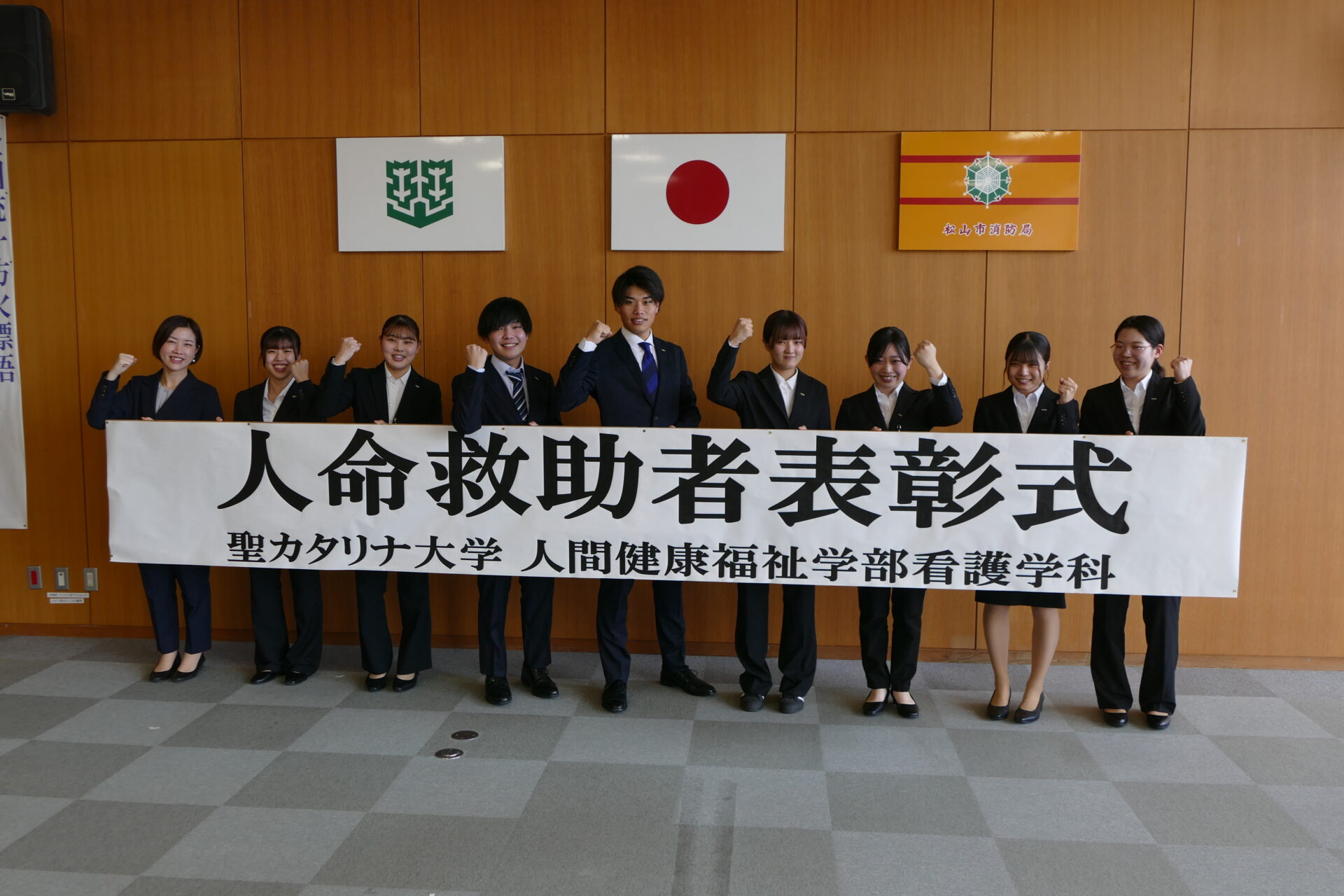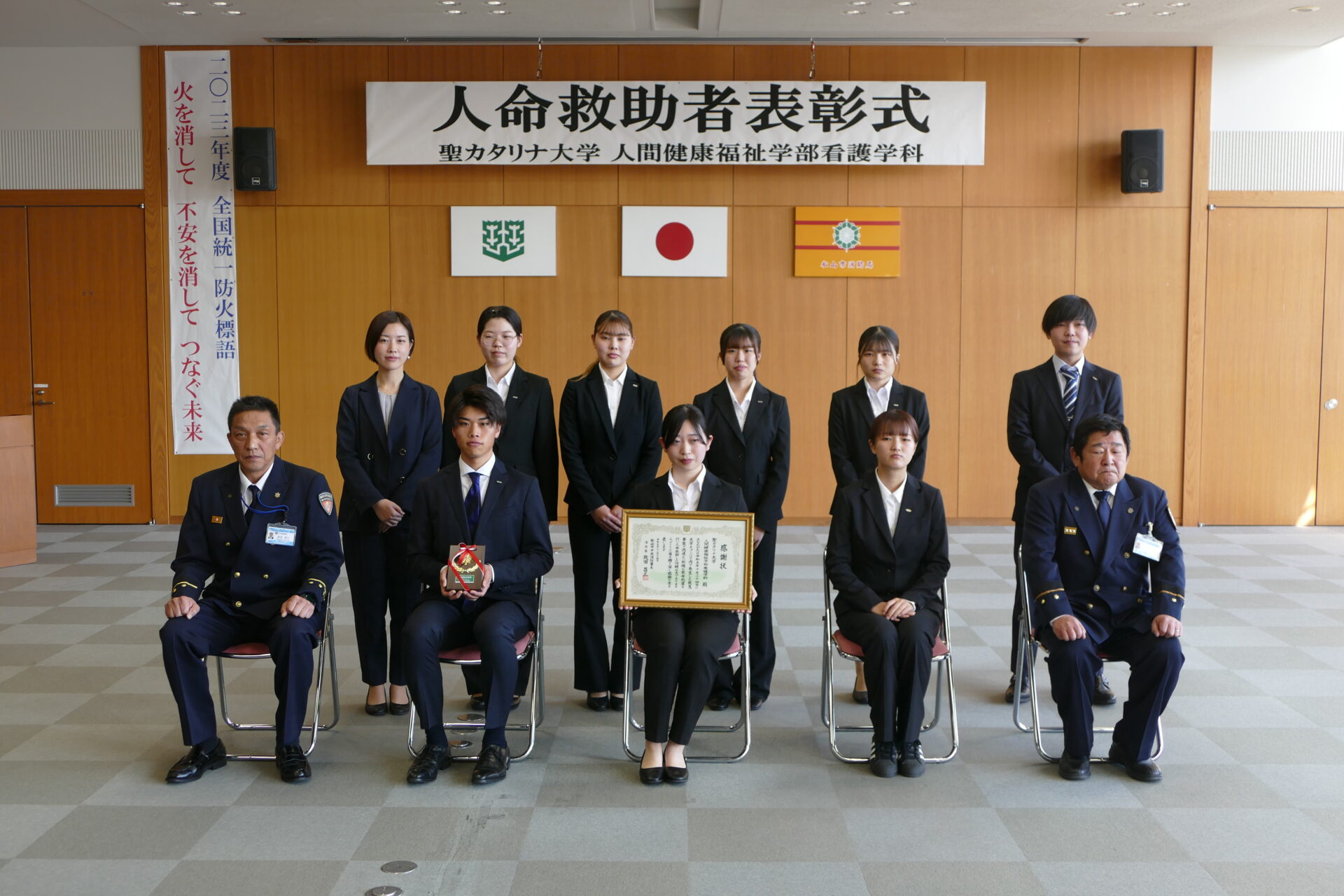 12月14日(木)、松山中央消防署において人命救助者表彰(団体)があり、人命救助に関わった看護学科の学生11名(2年生8名、3年生3名)と教員1名が表彰されました。