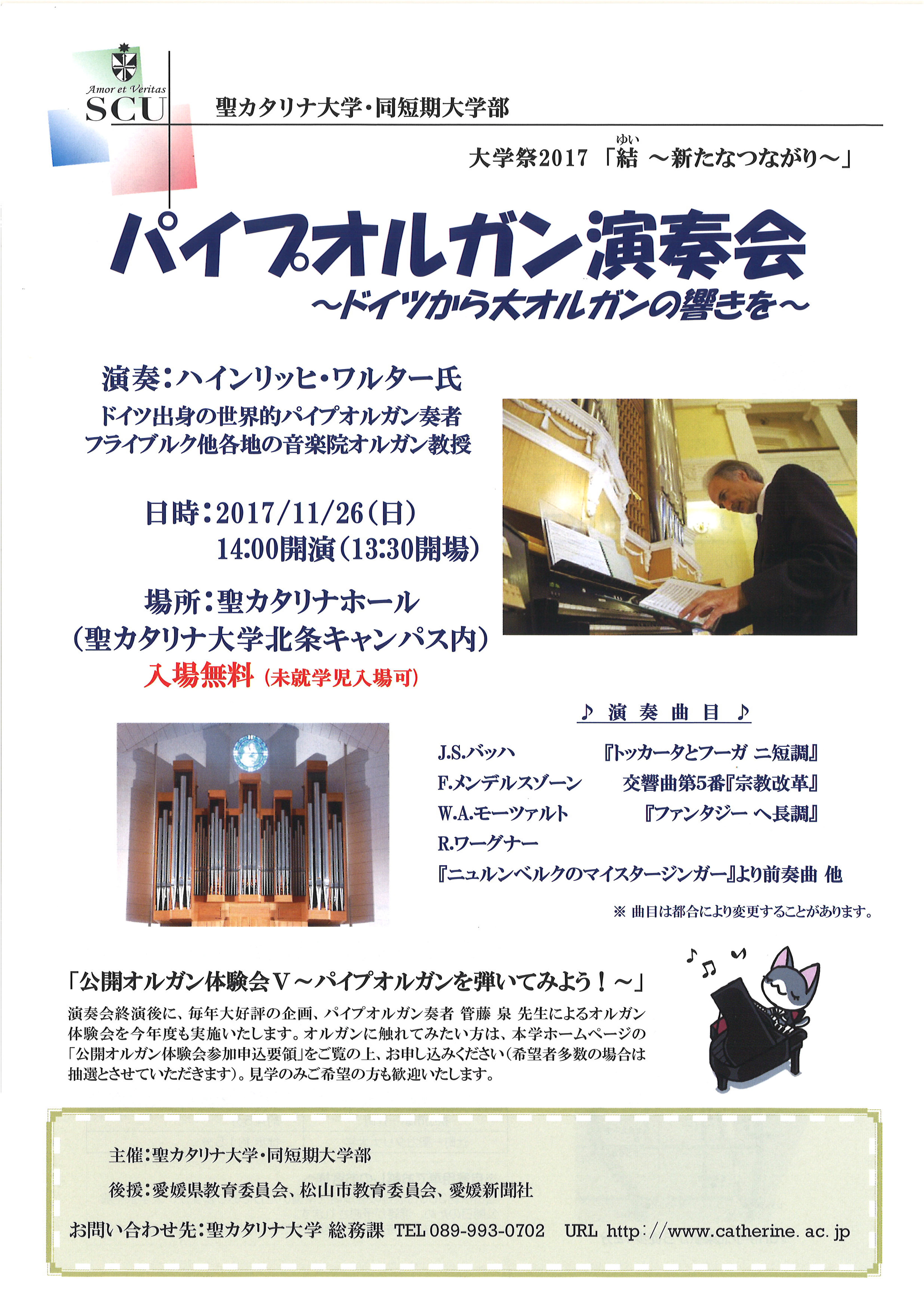 聖カタリナ大学・同短期大学部 大学祭2017の最終日に企画いたしましたので、多くの皆様のご来場をお待ちしております。 荘厳で音響豊かな聖カタリナホールで、西日本最大規模のパイプオルガンの音色によるゆったりとした上質な時間をお過ごしください。