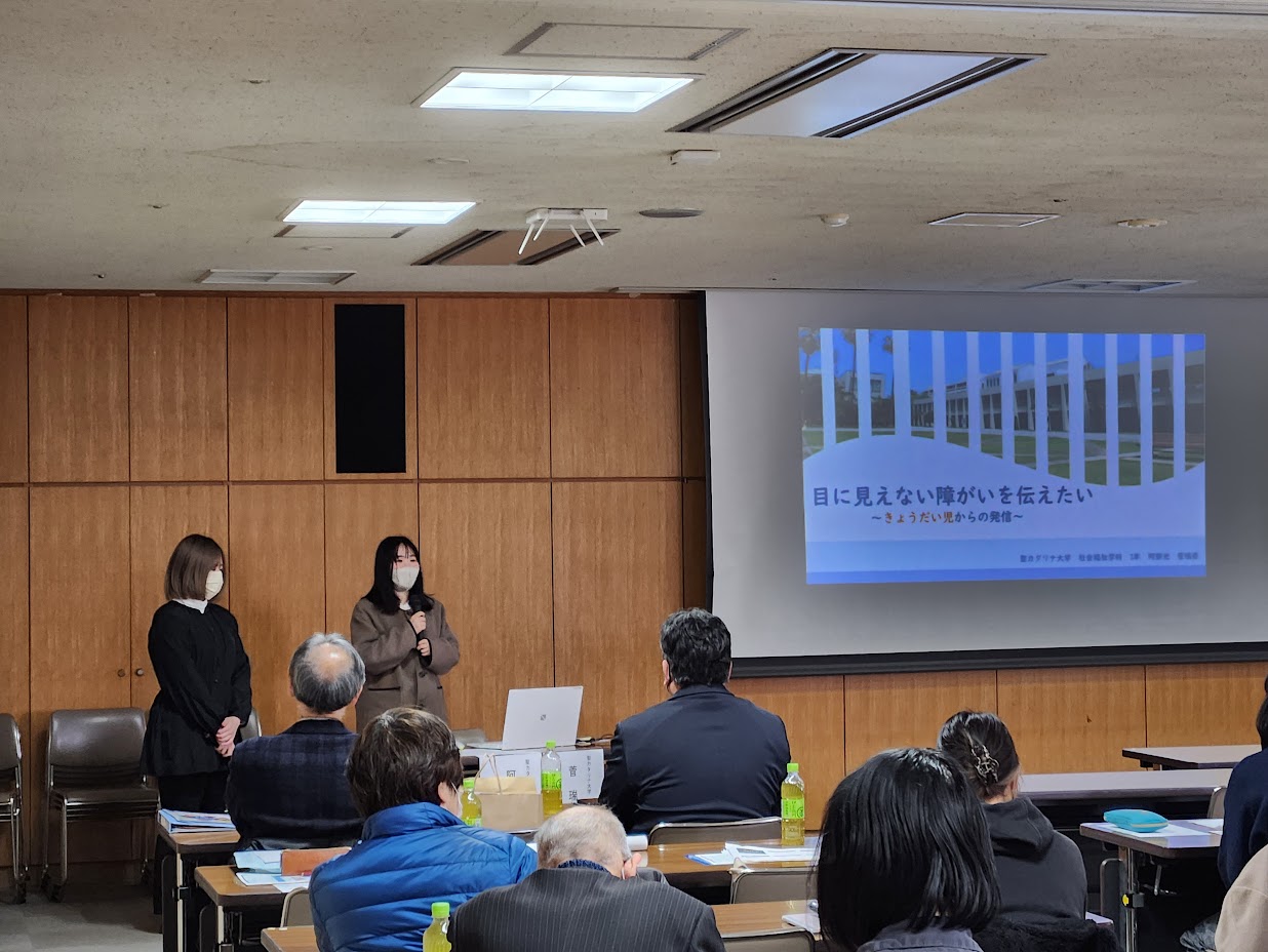 2月23日(金)に松山市総合福祉センターで開催された愛媛県社会福祉士会 障害福祉委員会主催「障害福祉ワーカーのよりドコロ」に、近藤ゼミ3回生の2名が登壇しました。障害当事者本人、親、障害福祉に従事する支援者たちを前に、前半は『障害当事者の話をできるだけたくさん聴く会』というテーマの下、きょうだいの立場から想いを語りました。後半のシンポジウム『福祉サービスなどに思うこと~当事者が求めていることと支援者が提供しようとしていることのずれを解消するために。ニーズ中心の支援に立ち戻るために~』では、きょうだいとしての体験をふまえ、共生社会実現への課題を述べたり、提供されてきた支援に疑問を投げかけたりする場面もありました。