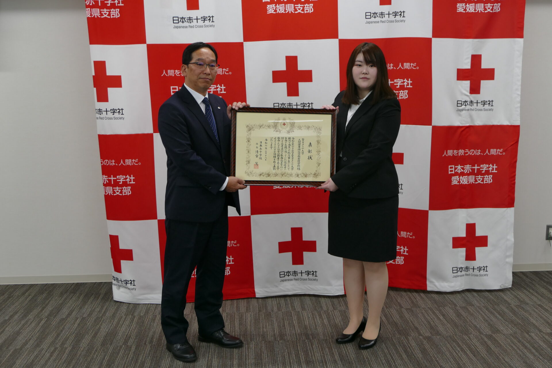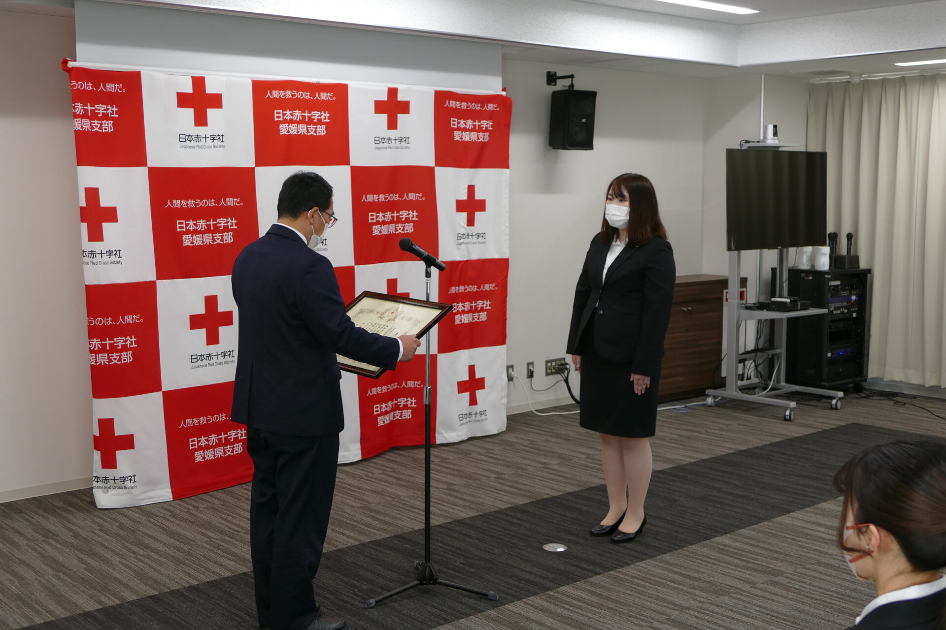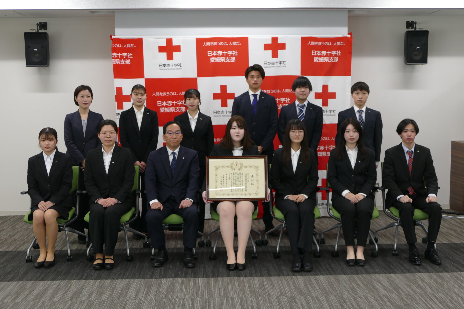 3月18日(月)、松山市駅キャンパスにおいて、日本赤十字社人命救助者表彰状の贈呈式が執り行われ、昨年10月24日に松山市駅キャンパス内で人命救助を行った看護学科の学生11名と教員1名に対し、日本赤十字社愛媛県支部河瀬利文事務局長から感謝のお言葉とともに表彰状が贈呈されました。