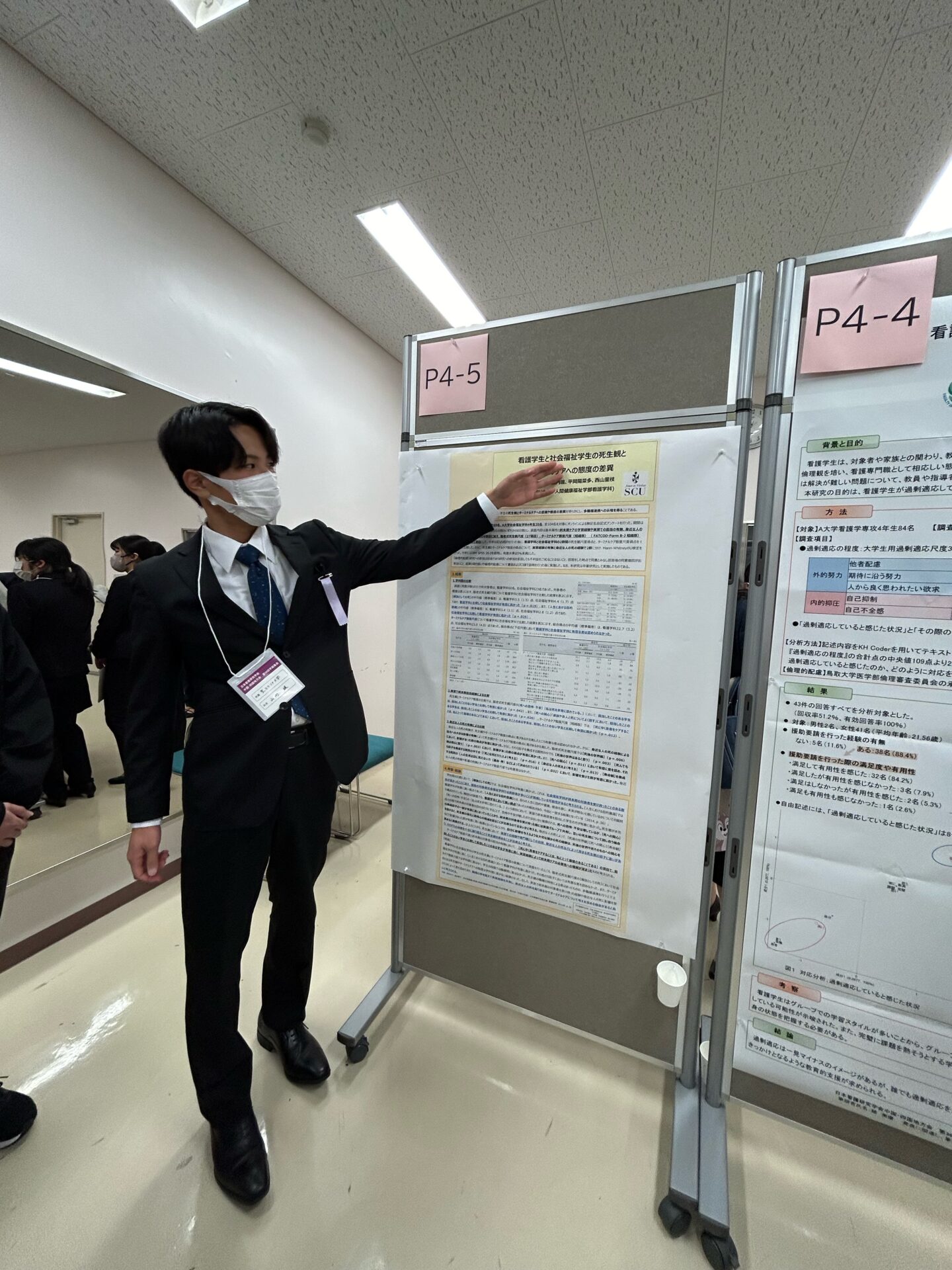 発表テーマは、卒業研究にて取り組んだ「看護学生と社会福祉学生の死生観とターミナルケアへの態度の差異」、「臨地実習・講義による看護学生の高齢者に対するエイジズムや態度の変化」でした。