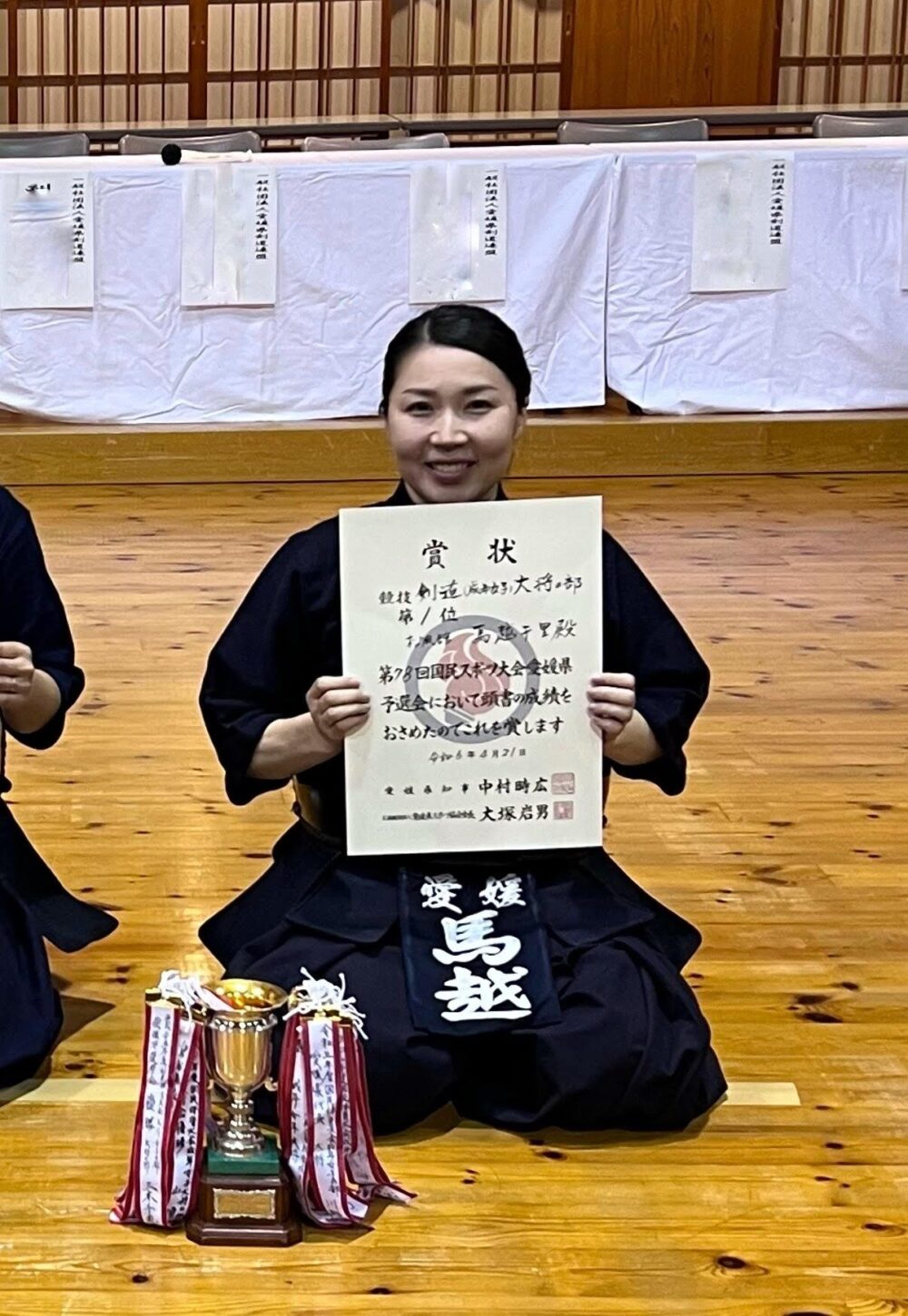 4月21日(日)愛媛県武道館において第78回国民スポーツ大会「SAGA2024」剣道競技(成年男女)愛媛県予選会が開催されました。本予選会において成年女子団体・大将の部で、健康スポーツ学科所属・剣道部顧問の馬越助教が優勝し、愛媛県代表選手に決定いたしました。