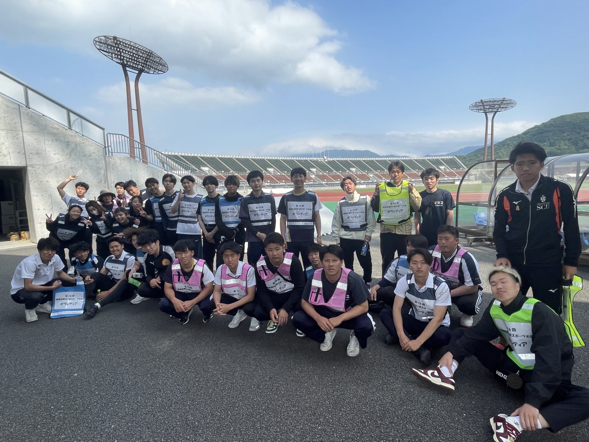 5月26日(日)に愛媛県総合運動公園陸上競技場にて開催された、愛媛県障がい者スポーツ大会の陸上競技の部において、前期開講科目「障がい者スポーツ」を履修している健康スポーツ学科3、4年生36名がボランティアスタッフとして参加しました。