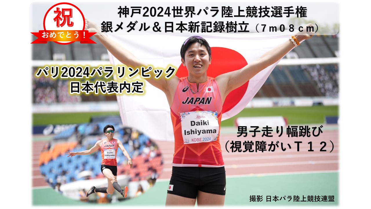 ※石山選手は、神戸2024世界パラ陸上競技選手権の男子走幅跳・視覚障がいのクラスにおいて、自らが持つ日本記録を1cm更新する7m8cmをマークし、見事銀メダルを獲得しました。