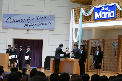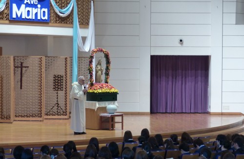 5月17日(水)、聖母マリアをたたえる宗教行事である「母をたたえる日」の集いがあり、学長からの講話や学生による献花・共同祈願等の聖母マリアへの祈りの後、後援会奨励金の授与が行われました。