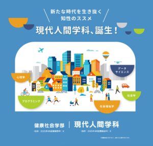 現代人間学科では、社会学・社会福祉学を基礎に、心理学の視点も用いて、現代における多様な人間と社会の有り様を理解するとともに、それらの抱える諸課題を発見し、それらの課題の解決を統計学やデータサイエンスの知識も活用して探求することにより、持続可能な地域社会の営みに広く貢献できる人材の養成を目指して参ります。