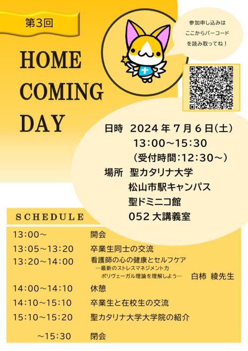 旧友との「再会」と新たな「出会い」 ホームカミングデーは、年に一度の交流イベントです。卒業生には同窓生や先輩、後輩、恩師と旧交を温めていただき、在学生には卒業生との貴重な交流の機会になります。この度、3回目のホームカミングデーを松山市駅キャンパスで開催することになりました。最新のストレスマネジメントについて精神看護の専門看護師から直接学べる場も設けています。 卒業生のみなさん、久しぶりに近況を語り会いませんか?みなさんにお会いできることを心より楽しみしております。