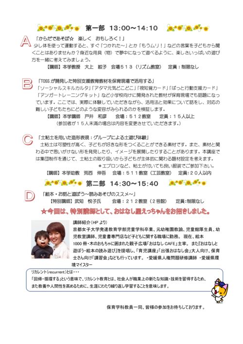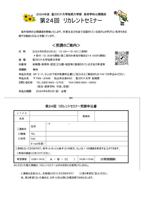 保育学科公開講座リカレントセミナーのページ 第24回保育学科リカレントセミナー | 公開講座 | 聖カタリナ大学・聖カタリナ大学短期大学部 (catherine.ac.jp)