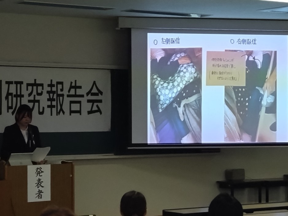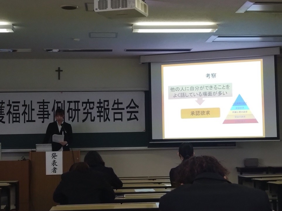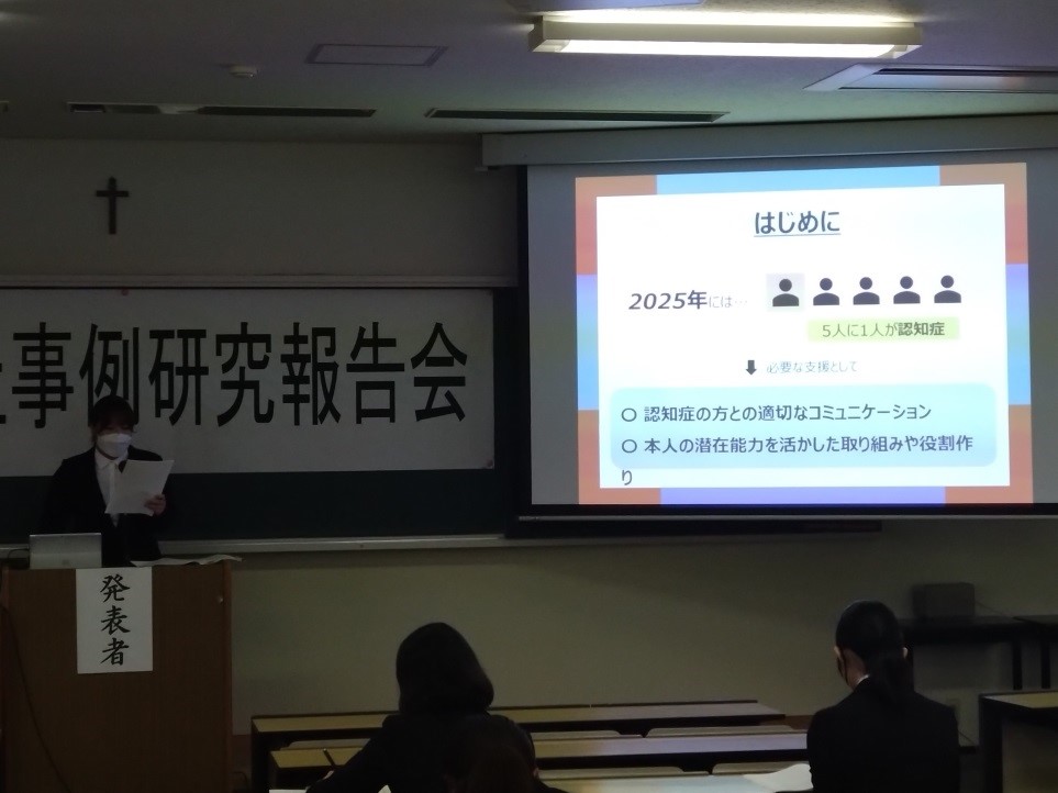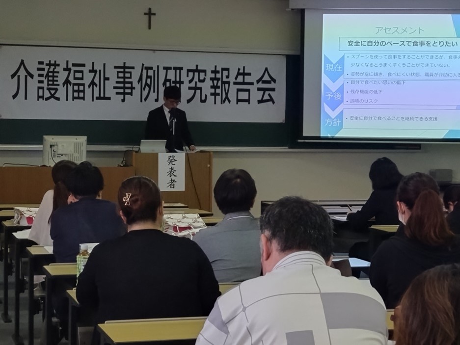 社会福祉学科学生(令和3年度入学生)が、介護福祉実習第1期から第3期(450時間)の集大成として、現場実習で受け持たせていただいた利用者に対する介護過程をケーススタディとしてまとめ、発表しました。施設長、実習指導者をはじめ介護福祉士養成施設教員の方々にもご来場いただき、求められる介護についての考察、学生が育んだ自身の介護観について報告しました。