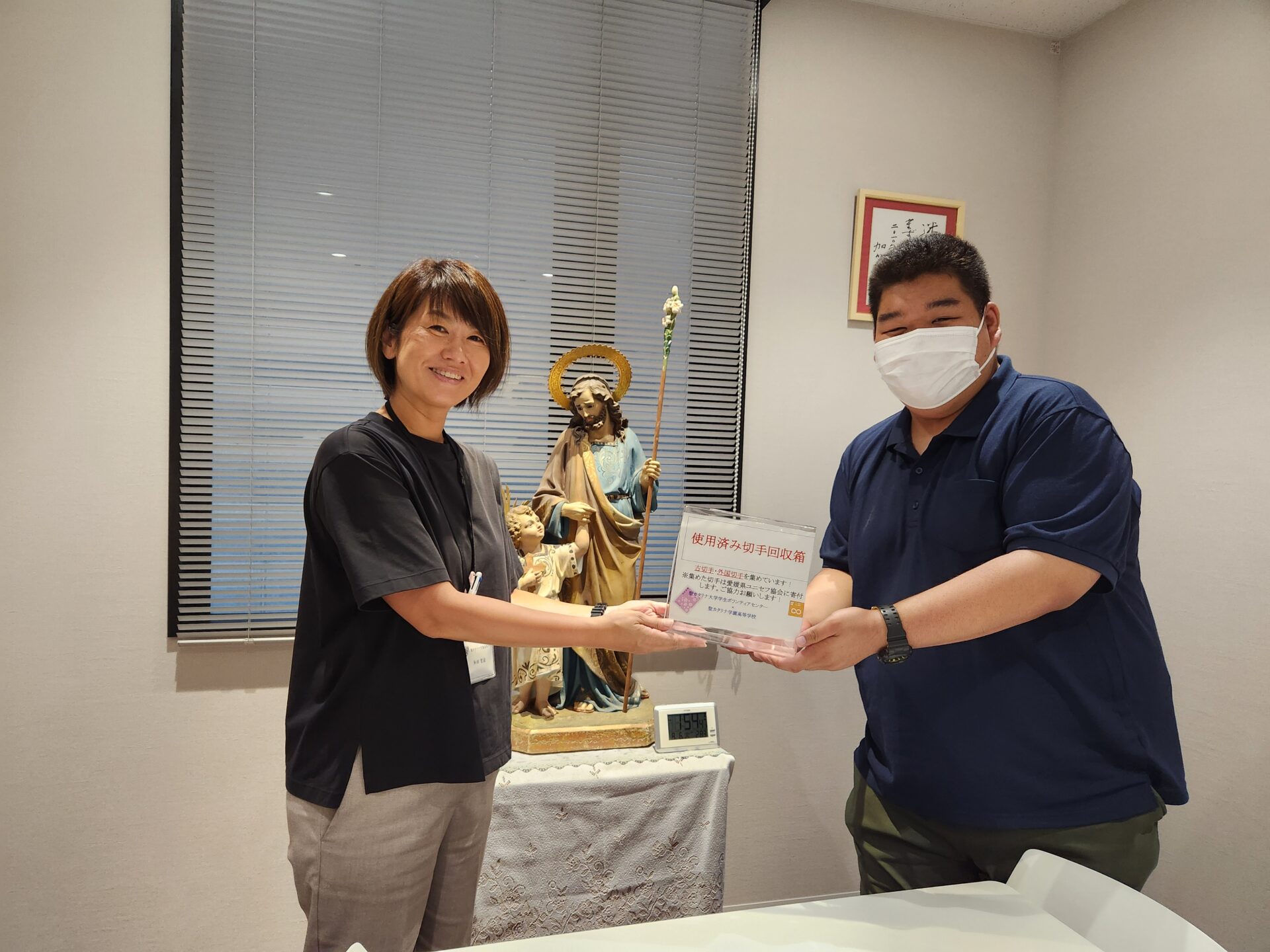 学生ボランティアセンターでは使用済み切手の回収を行い、愛媛県ユニセフ協会に寄付する取り組みを進めています。 この度、聖カタリナ学園高等学校と連携することになり、学生ボランティアセンター長が回収箱を届けました。 大学と高等学校が協力して使用済み切手を回収することで、支援の強化を図ります。