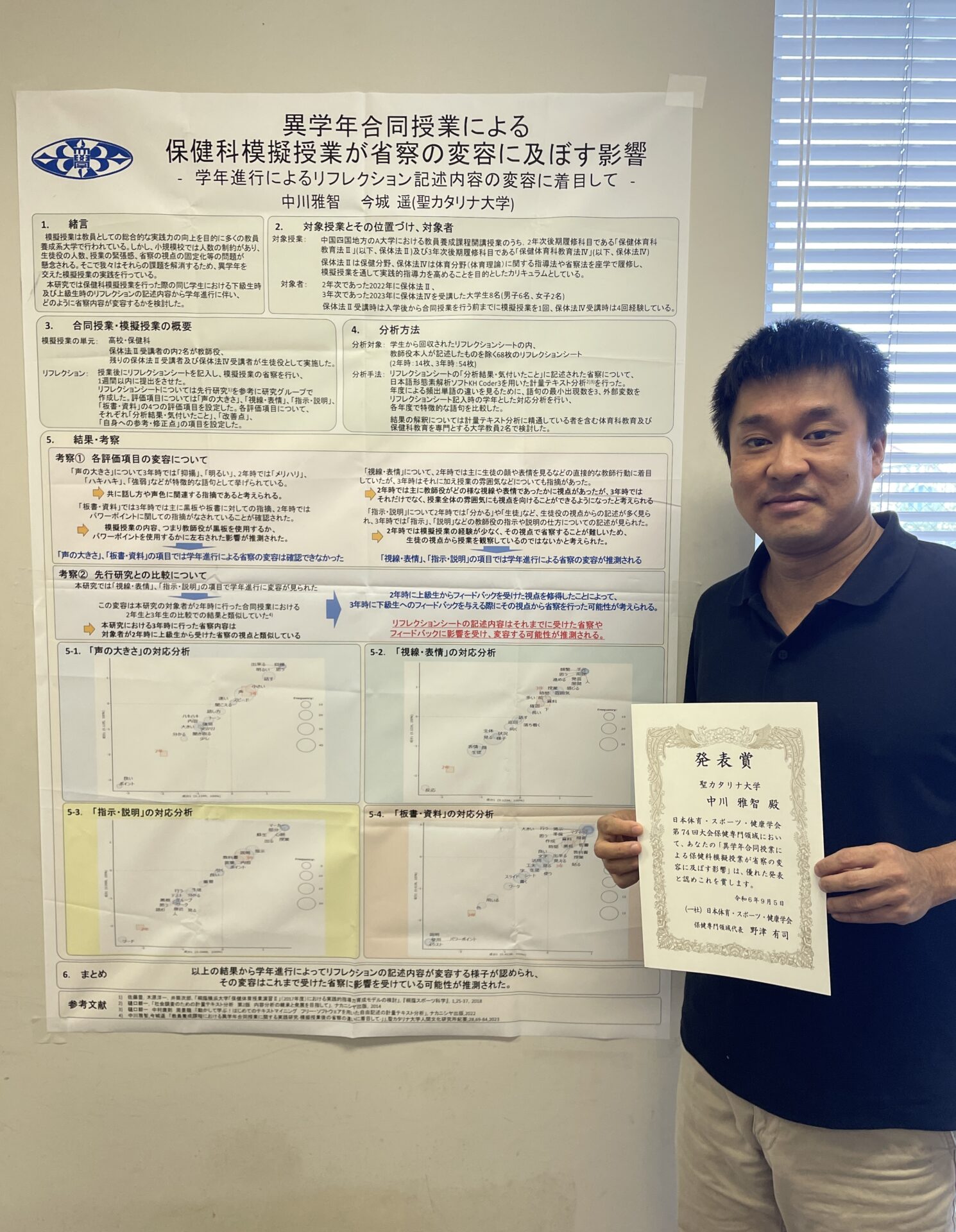 8月29日(木)~8月31日(土)に福岡大学にて開催されました、日本体育・スポーツ・健康学会第74回大会において、中川雅智 准教授、今城 遥 助教が発表した演題「異学年合同授業による保健科模擬授業が省察の変容に及ぼす影響」が、保健専門領域の発表賞を受賞しました。