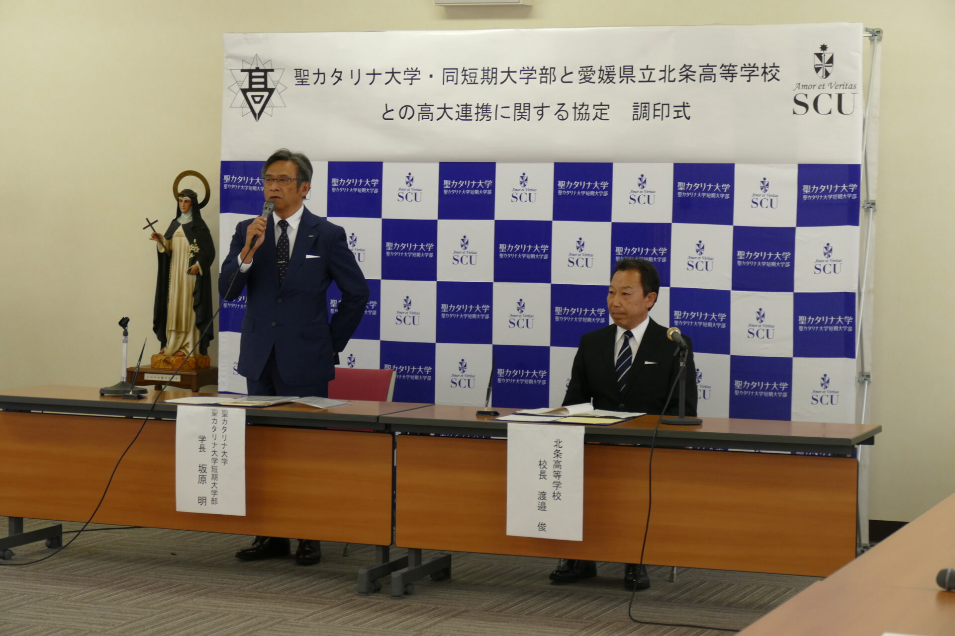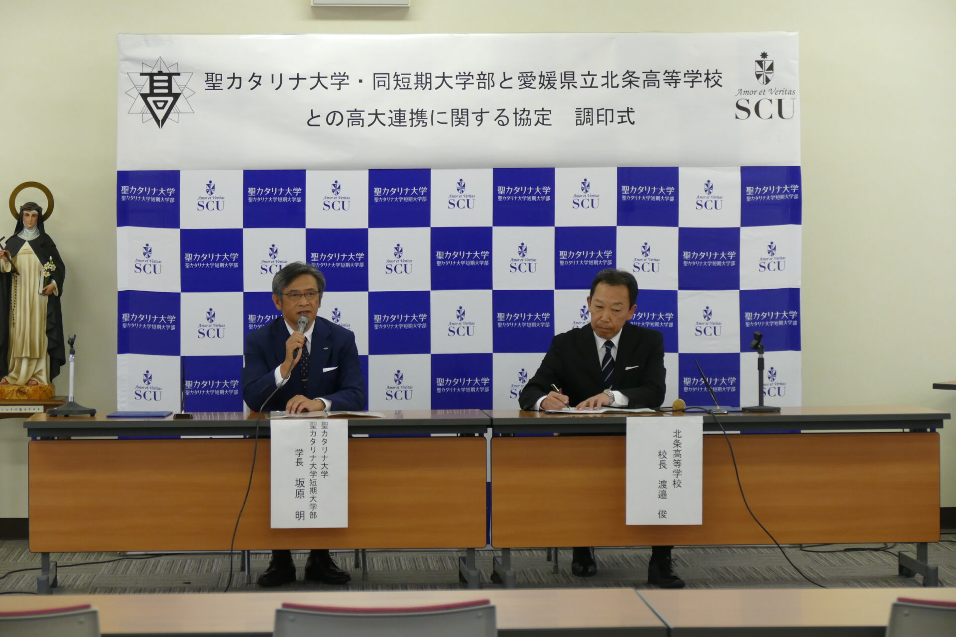 調印式では、北条高等学校 校長 渡邉 俊様と聖カタリナ大学・聖カタリナ大学短期大学部 坂原 明学長が協定書を交わしました。