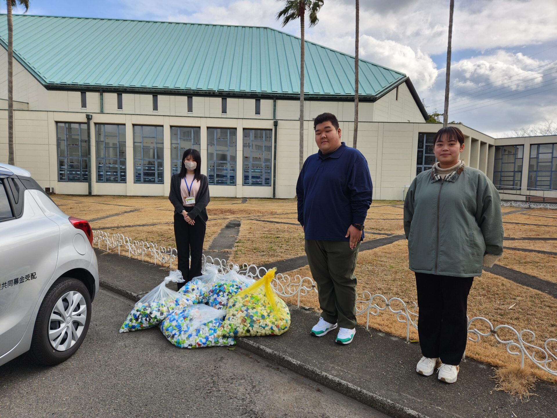 2月6日(木)、北条キャンパスと松山市駅キャンパスで回収した約20kgのペットボトルキャップを松山市社会福祉協議会へお渡ししました。これにより、2024年度の回収量は約37kgとなりました。回収されたキャップはリサイクル業者に引き渡され、その売却益が「認定NPO法人 世界のこどもにワクチンを 日本委員会」に寄付されます。