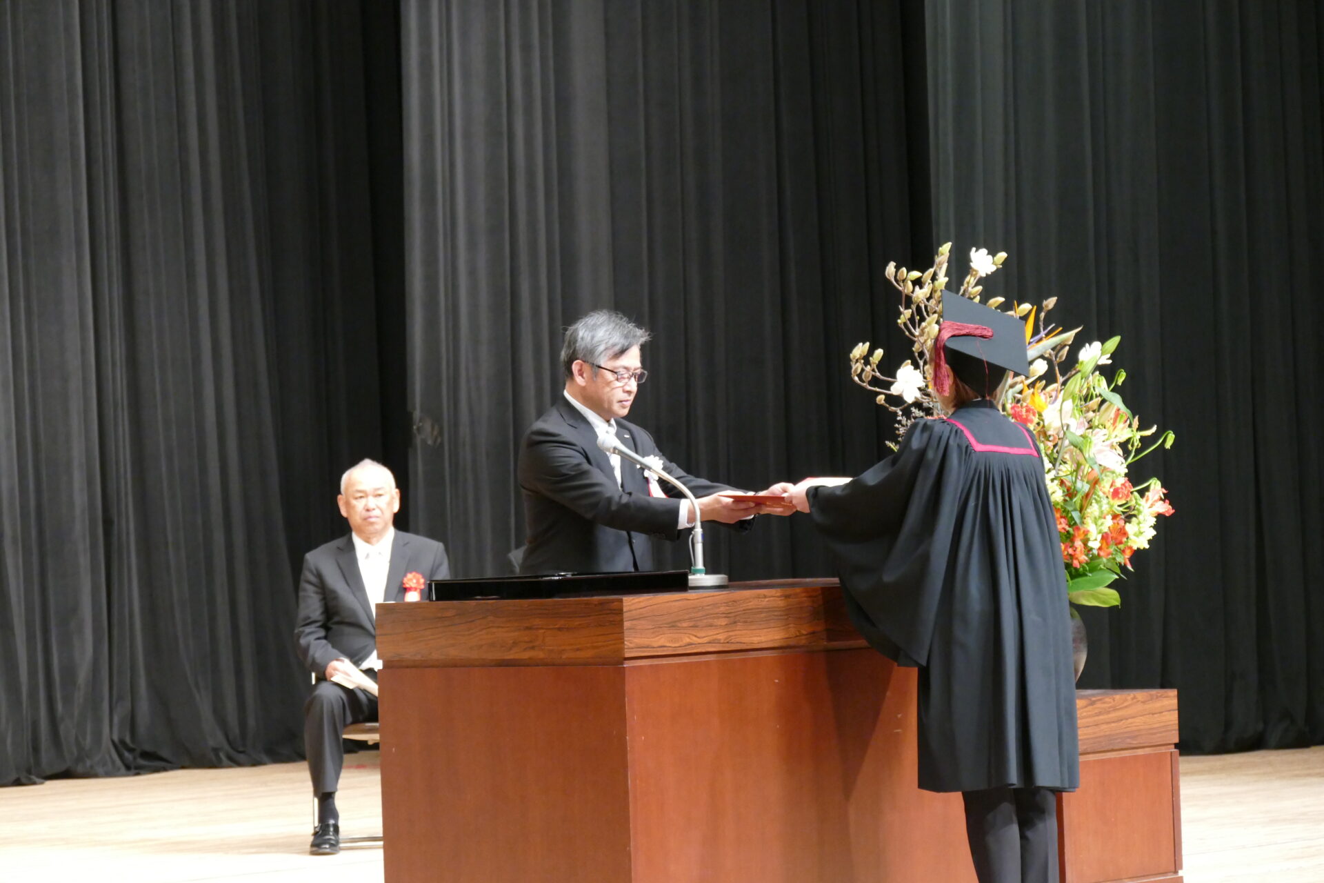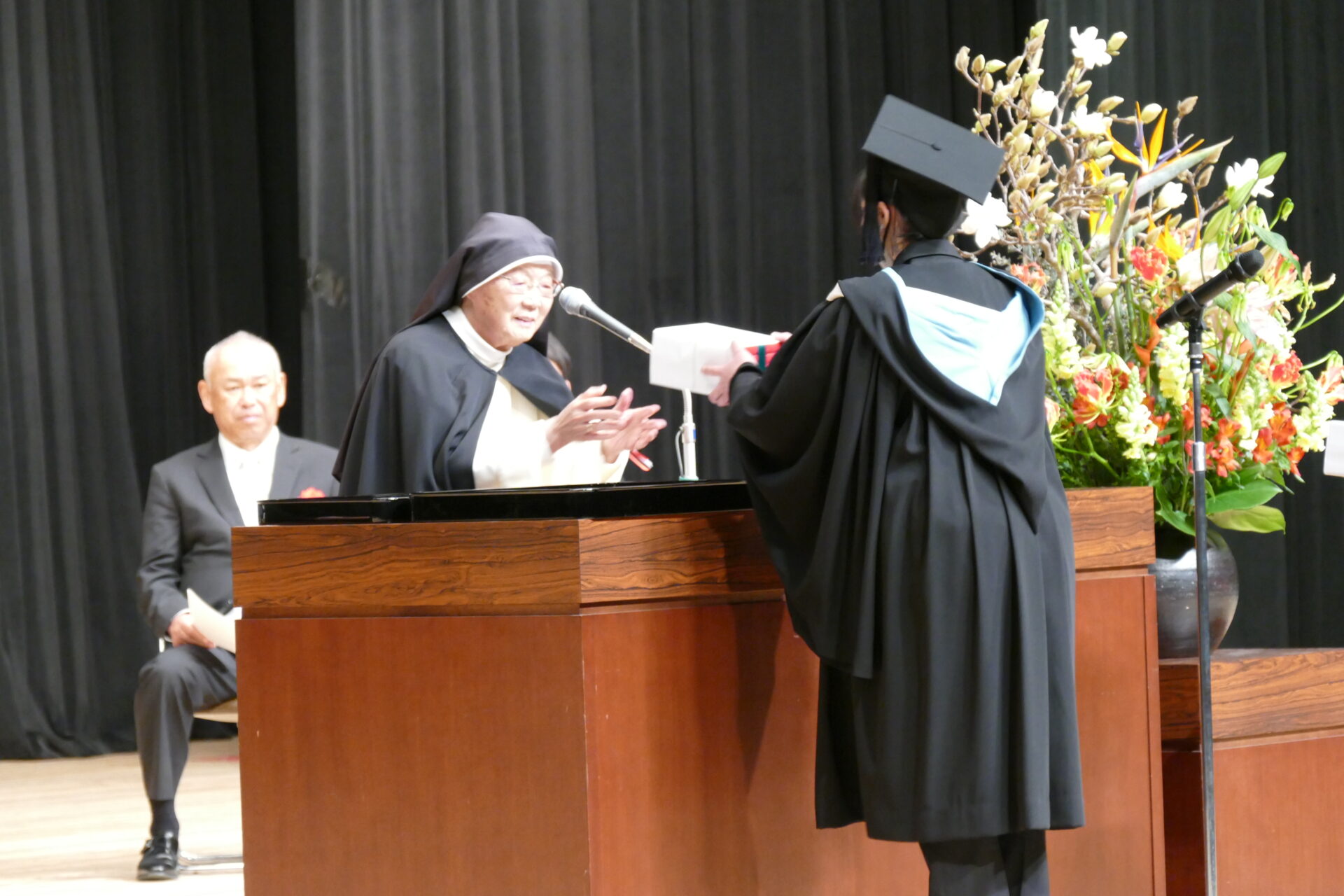 当日は厳かな雰囲気の中、卒業生・修了生はガウンと角帽で正装して聖歌斉唱や聖書朗読を行いました。その後、坂原学長から各学科の代表者に卒業証書が授与されました。
