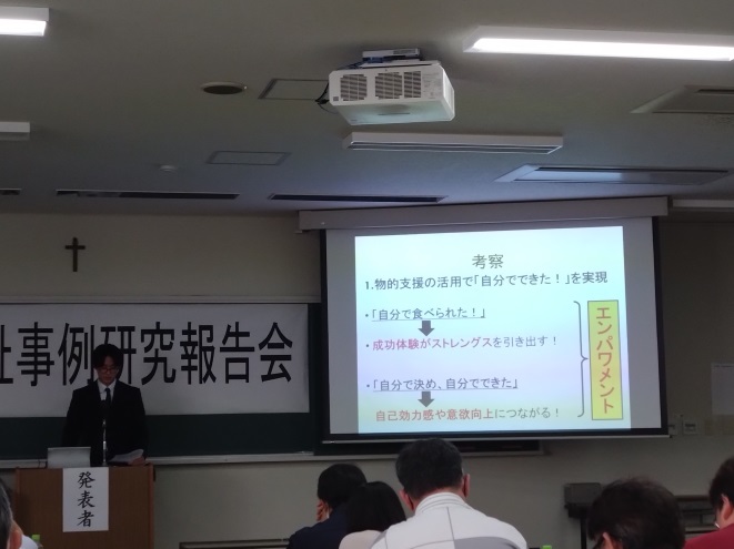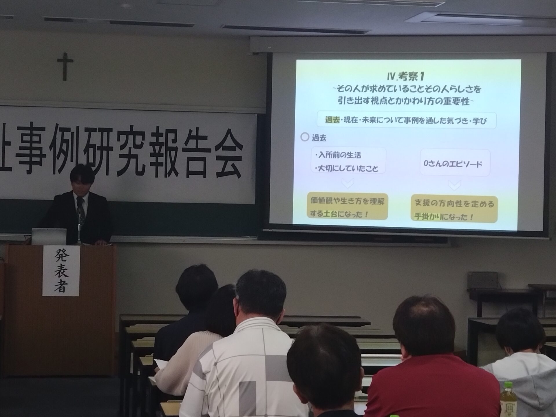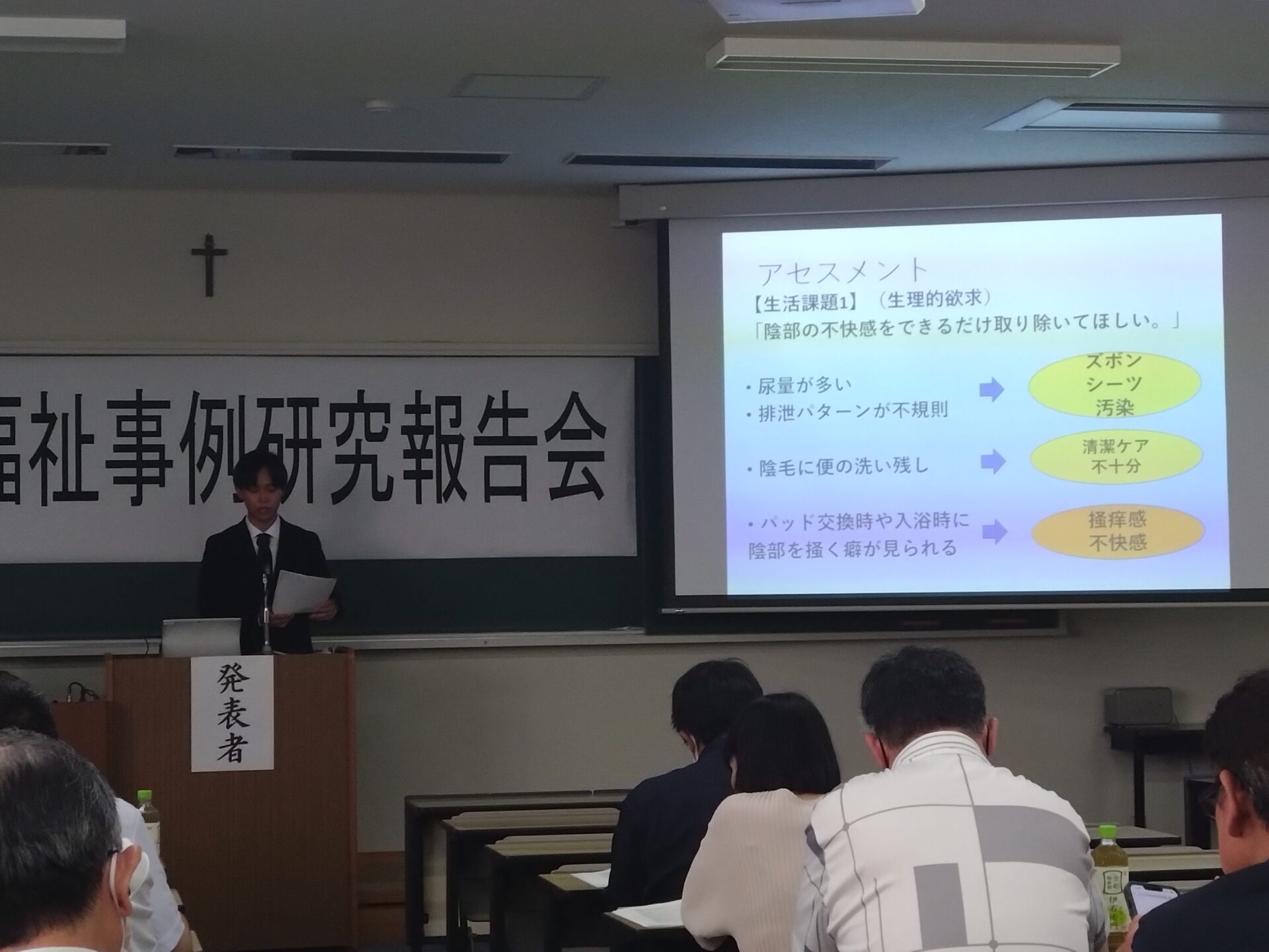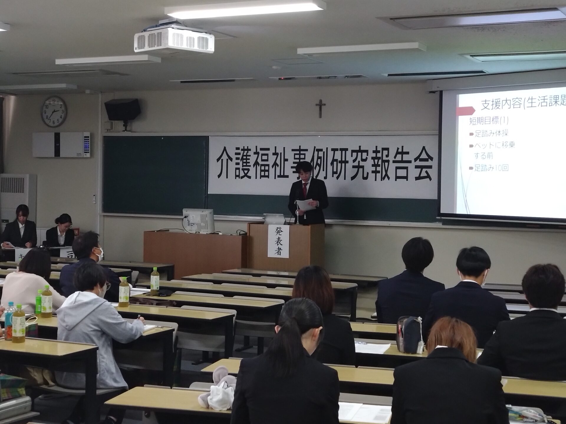 2025年7月5日(土)「介護福祉事例研究報告会」を開催しました。 社会福祉学科の学生(2022年度入学)が、延べ450時間にわたる介護福祉実習の集大成として、実習現場で受け持たせていただいた利用者の介護過程をケーススタディとしてまとめ、発表を行いました。 当日は、実習施設の施設長をはじめ、実習指導者、介護福祉士会の方々、介護福祉士養成施設の教員の皆様にご来場いただき、求められる介護のあり方についての考察や、学生自身の介護観について報告を行いました。