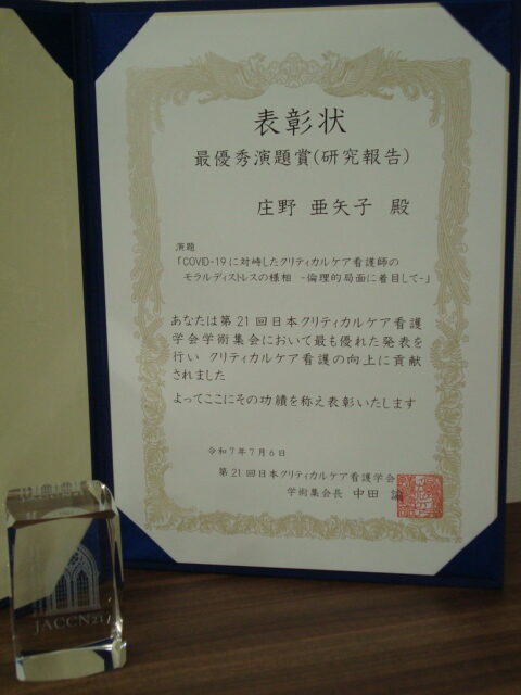 看護学科の庄野亜矢子講師が、2025年7月5日・6日に東京で開催された第21回日本クリティカルケア看護学会学術集会において、優秀演題4題の一つに選出されておりましたが、学術集会当日に優秀演題のプレゼンテーションを行い、見事、最優秀演題に選ばれ、表彰を受けましたのでご報告いたします。