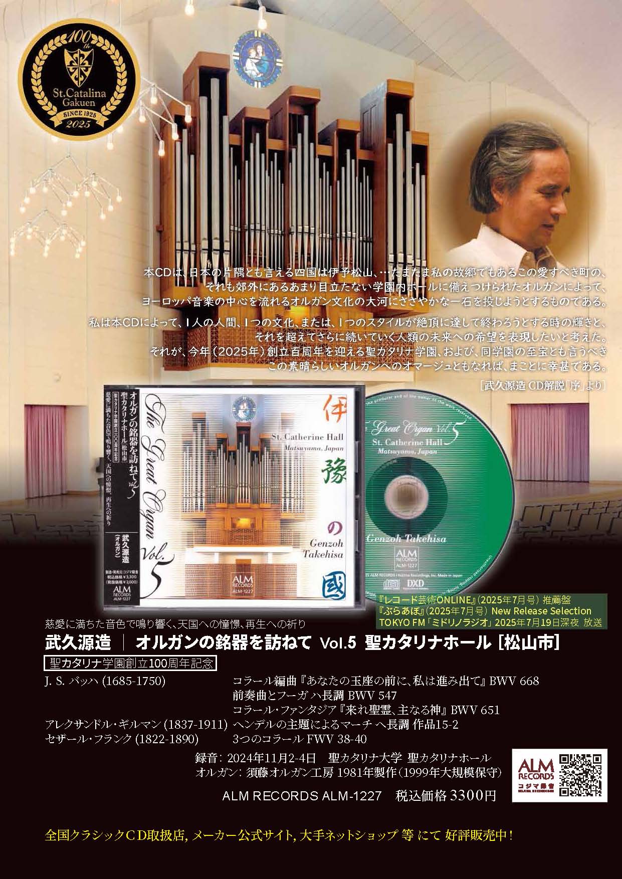 学園100周年記念プロジェクトの1つとして制作された、聖カタリナホールの大パイプオルガンを武久源造氏が演奏したCDが完成し、このほど発売されました。
